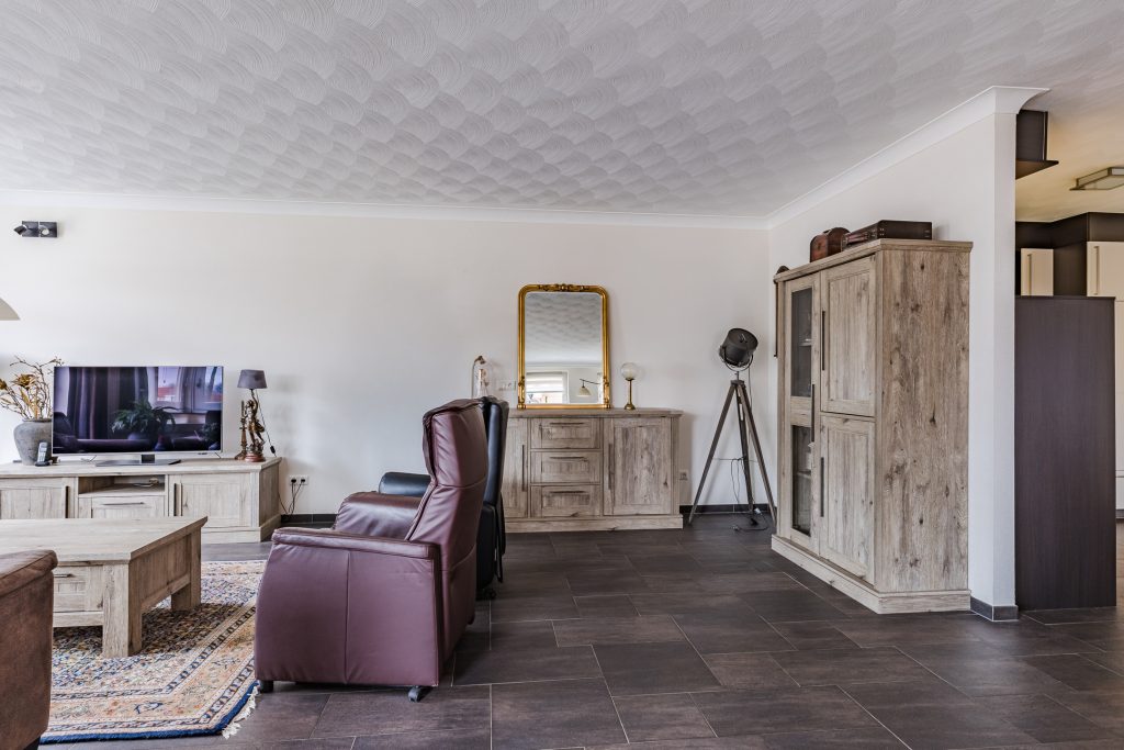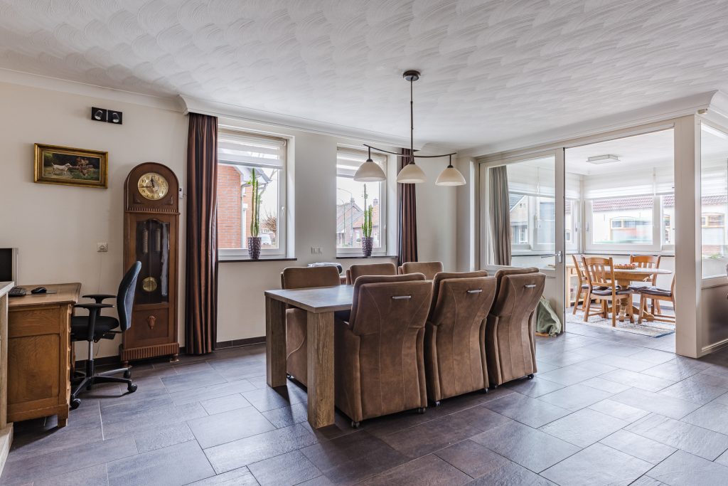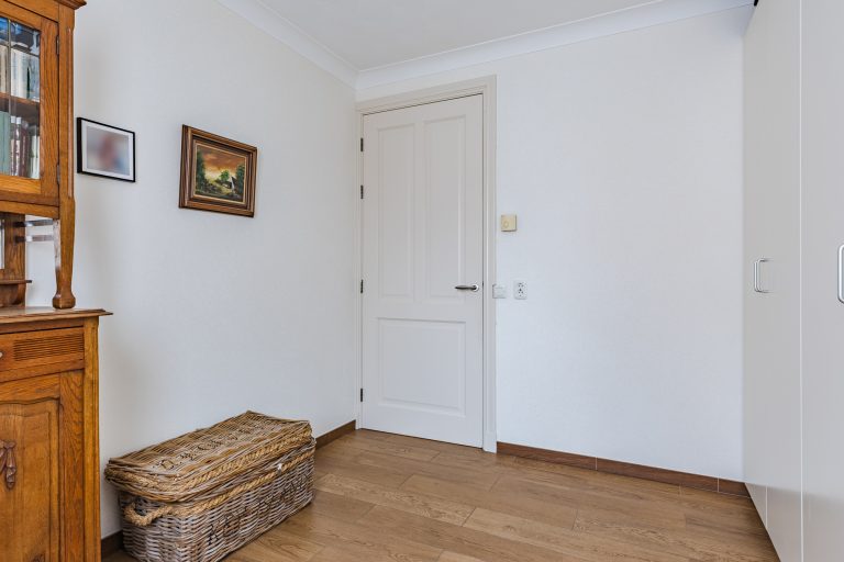 De riante en sfeervolle woonkamer vormt het centrale leefgedeelte van het appartement. Dankzij de royale afmetingen, de tegelvloer, strak gestucte wanden en een stucplafond met sierlijst heeft deze ruimte een luxe en uitnodigende uitstraling. Via een schuifpui staat de woonkamer in verbinding met de tuin- of werkkamer, een prettige extra ruimte die dankzij de schuiframen open contact met de straat kan creëren en zich uitstekend leent voor thuiswerken, lezen of als extra zitruimte.