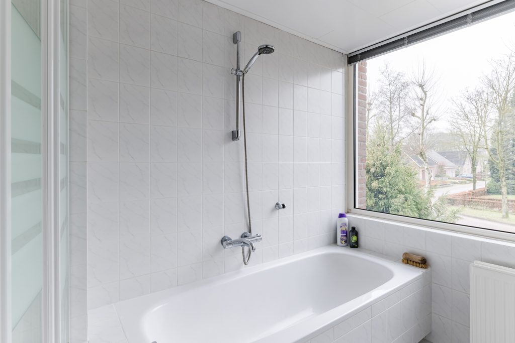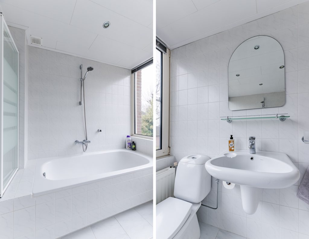De volledig betegelde badkamer is netjes uitgevoerd en voorzien van een ligbad-/douchecombinatie, wastafel, toilet en een MDF-plafond met inbouwspots.