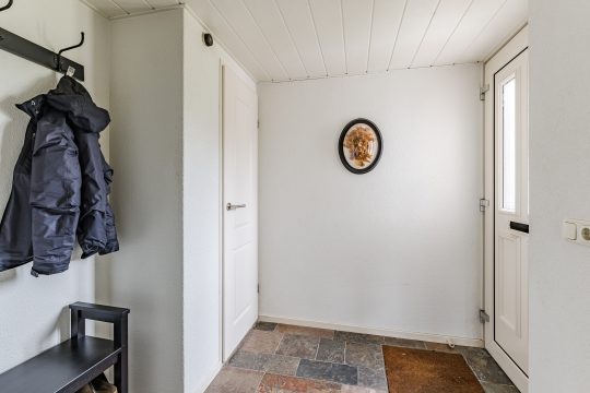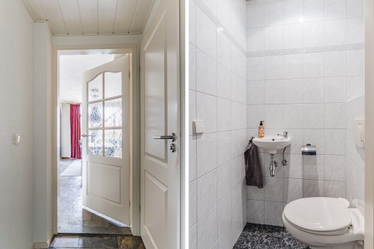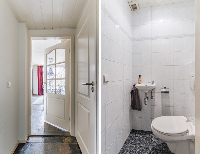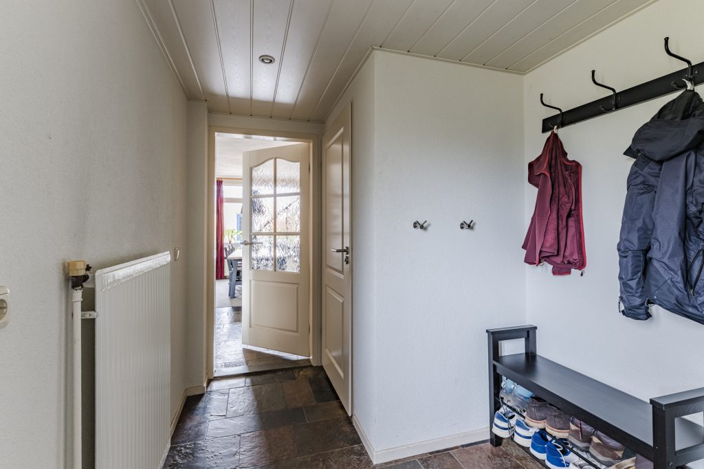 Via de nette voortuin bereik je de ruime hal, afgewerkt met een fraaie leisteen tegelvloer, garderobenis, meterkast en een volledig betegelde toiletruimte met wandcloset en fonteintje.