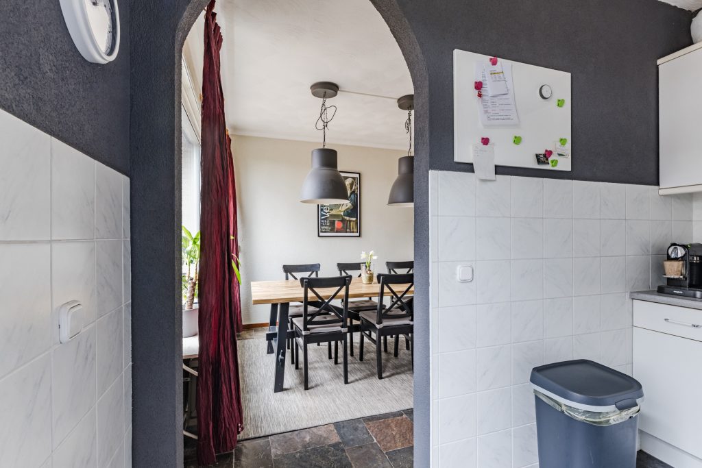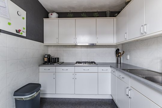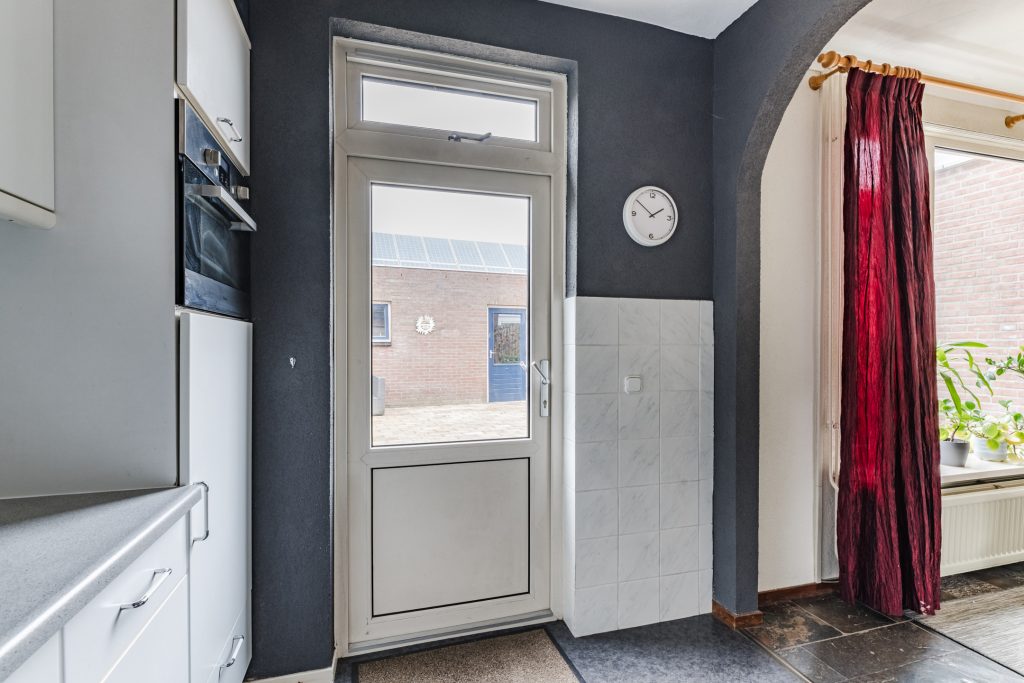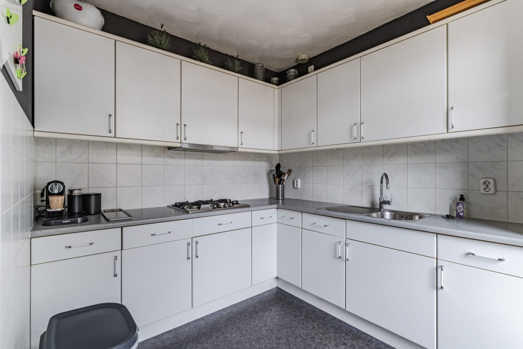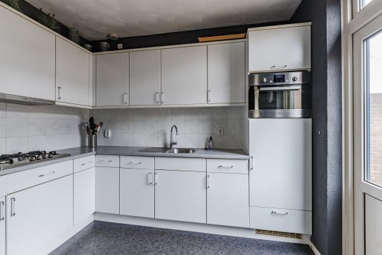Aan de achterzijde bevindt zich de half-open keuken, voorzien van een novilonvloer en een deur naar de achtertuin. De nette keukeninrichting in hoekopstelling beschikt over een gaskookplaat, afzuigkap, koelkast en combi-oven. Alle apparatuur is in 2018 vernieuwd, waardoor je hier zorgeloos kunt koken.