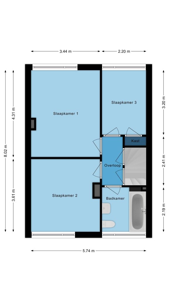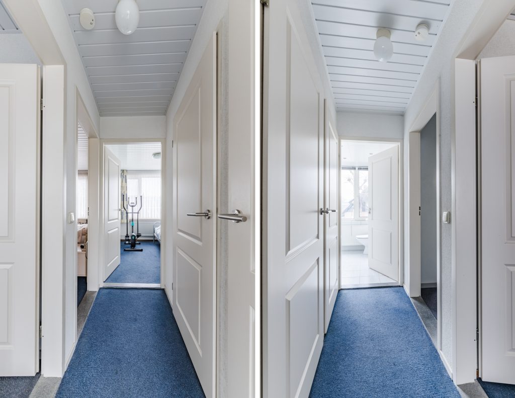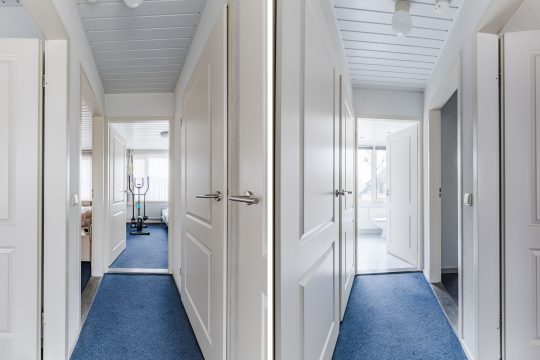 De overloop met vloerbedekking biedt toegang tot drie ruime slaapkamers, de badkamer én de vaste trap naar de tweede verdieping.