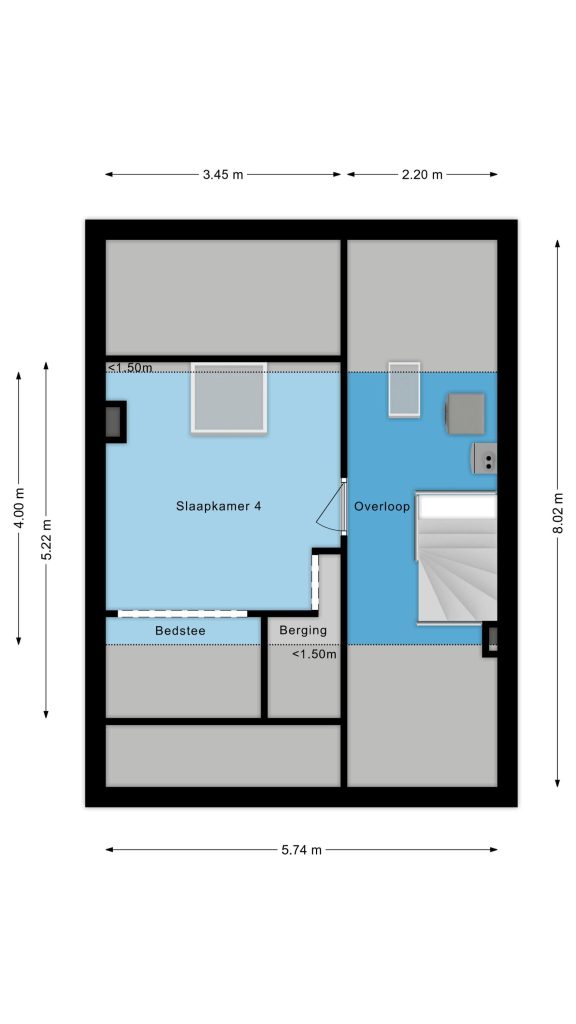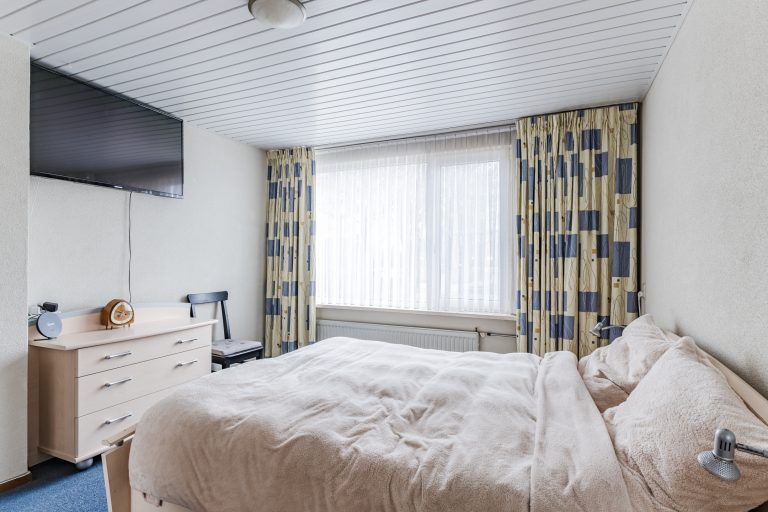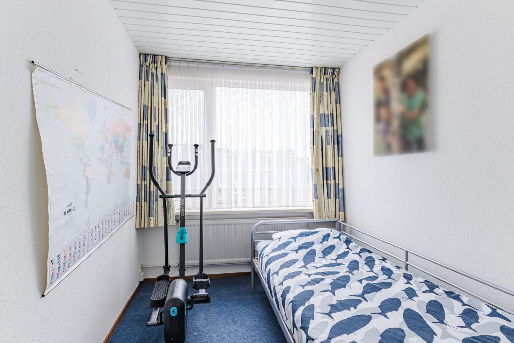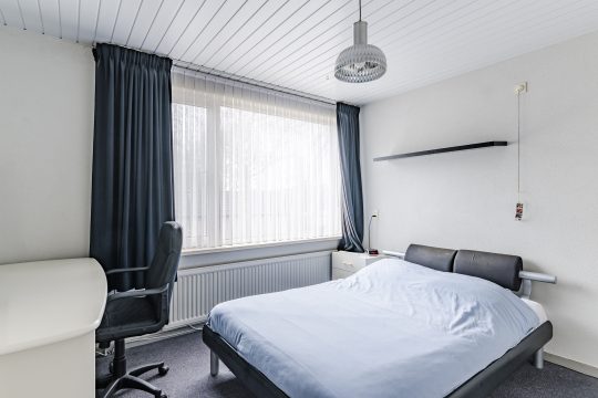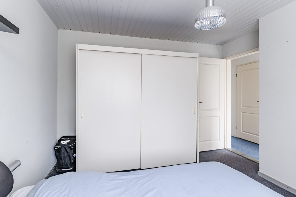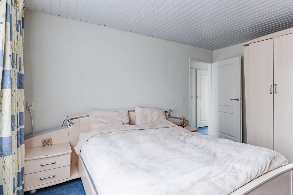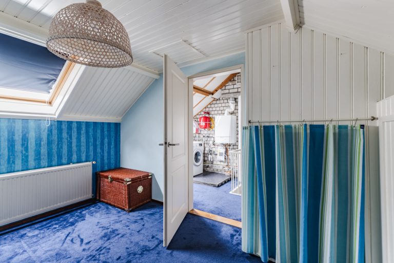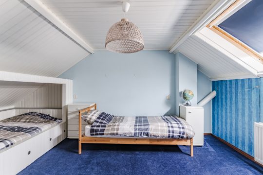 Aansluitend vind je de royale vierde slaapkamer: een sfeervolle ruimte met vloerbedekking, Velux dakvenster, handige bergruimte onder de dakschuinte en een luik naar de vliering. Extra bijzonder is de fraaie ingebouwde bedstee, wat deze kamer een uniek en speels karakter geeft.