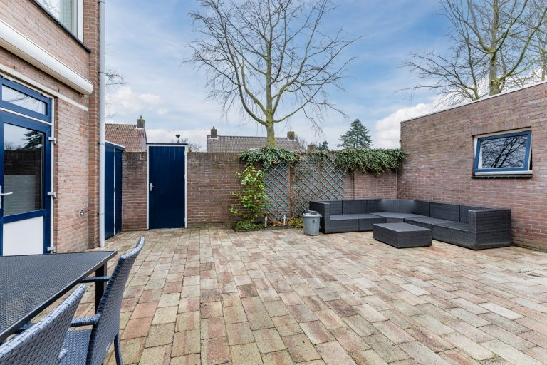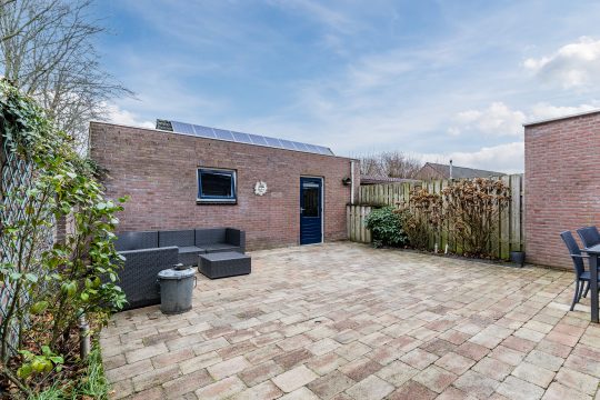 De privacy biedende, onderhoudsarme achtertuin is voorzien van sierbestrating, diverse beplanting, een elektrisch bedienbare zonneluifel, een aangebouwde berging en een praktische achterom met poort.
