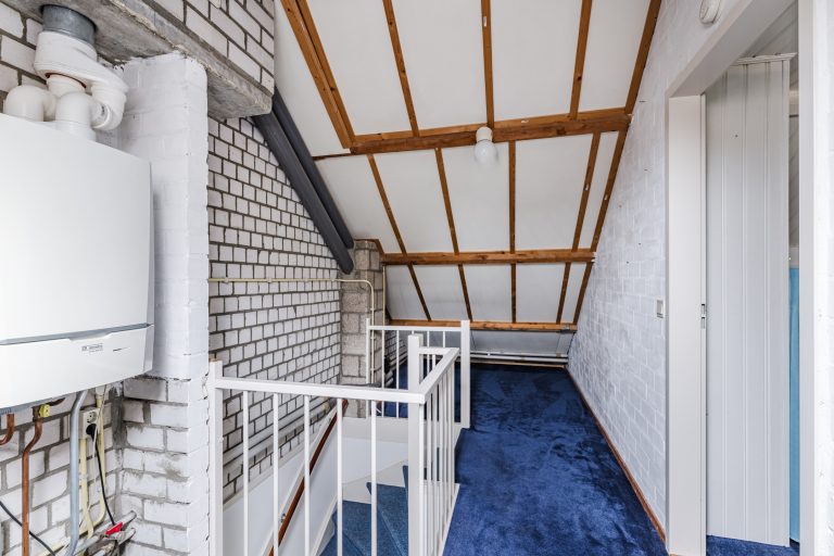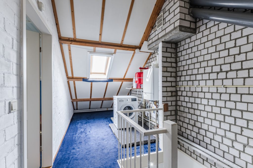Via een vaste trap bereik je de ruime voorzolder, met vloerbedekking, wasmachine-aansluiting, opstelling van de c.v.-installatie en een Velux dakvenster voor daglicht.