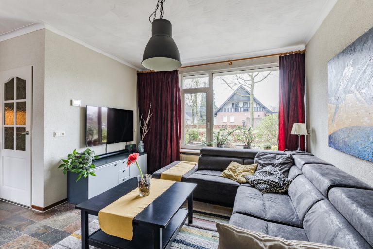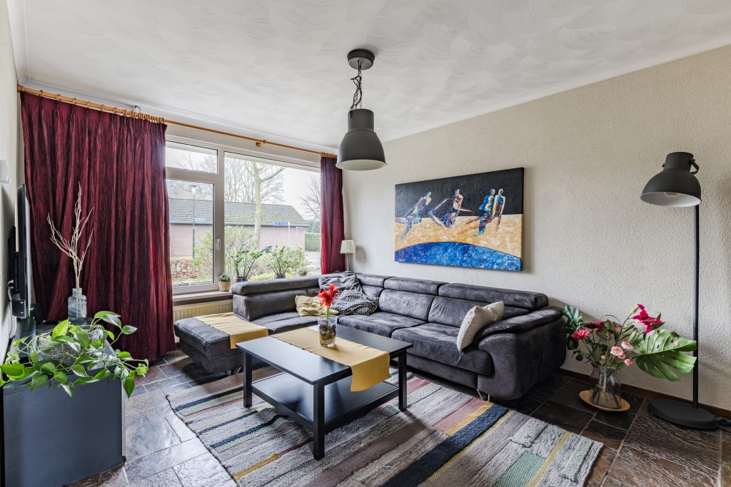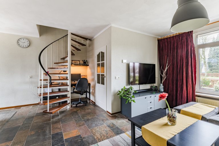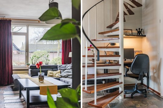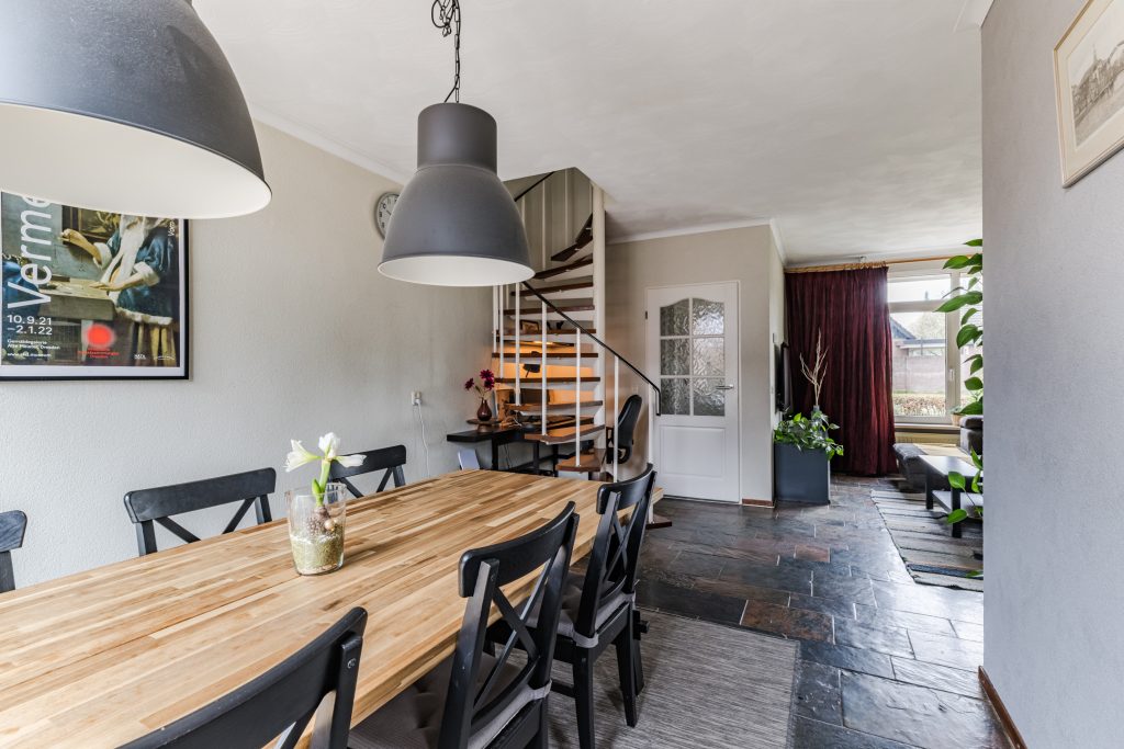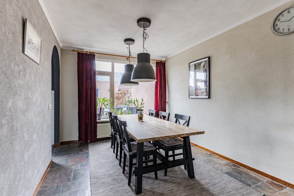 De hal geeft toegang tot de sfeervolle Z-vormige woonkamer. Deze lichte leefruimte valt direct op door de grote raampartijen, de leisteen tegelvloer, spachtelputzwanden en het stucwerkplafond met sierlijst. De trapopgang naar de eerste verdieping is hier subtiel geïntegreerd, wat zorgt voor een speelse indeling en een prettige woonbeleving.