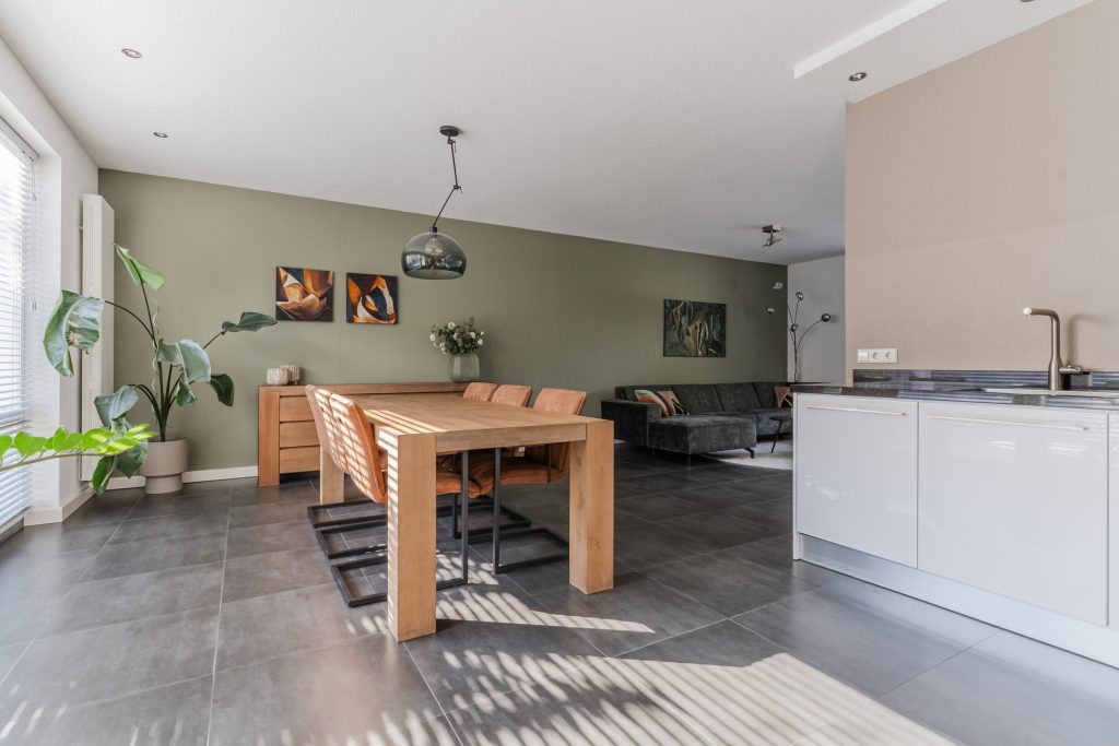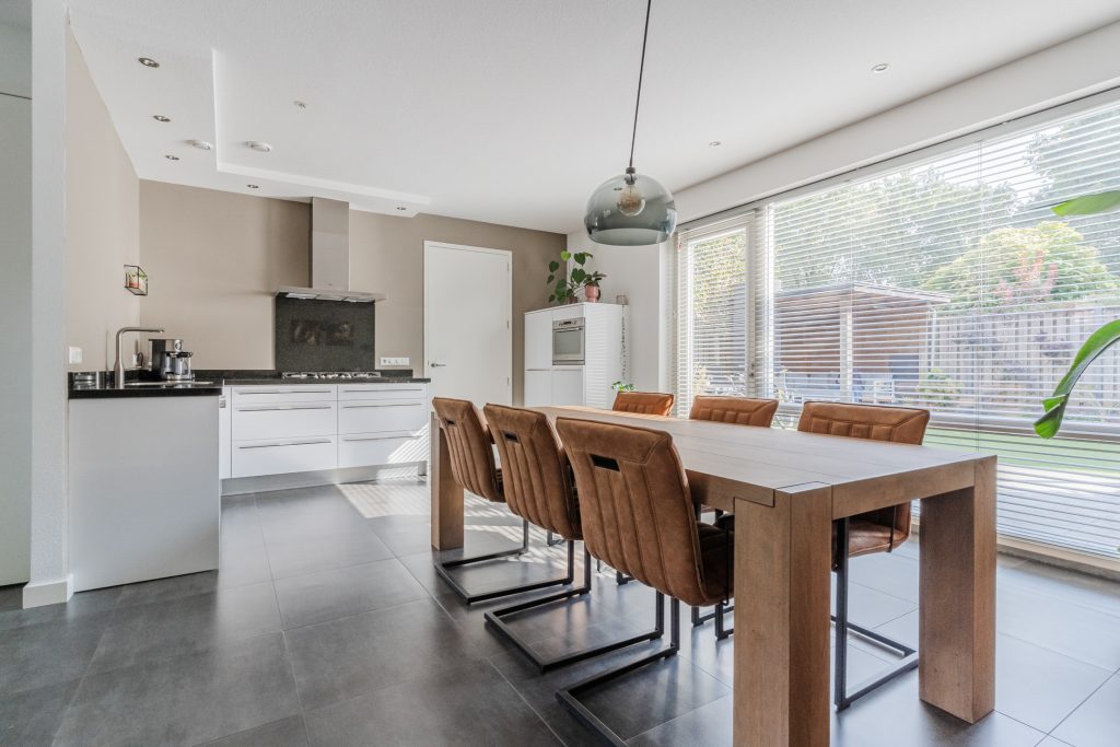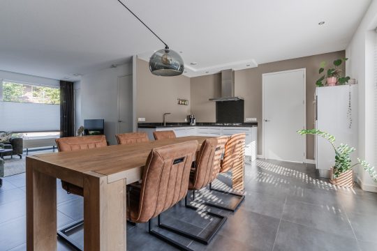 De open keuken vormt het hart van de woning – een echte eyecatcher! Uitgevoerd in een moderne stijl met hoogwaardige inbouwapparatuur, waaronder een 5-pits gasfornuis, afzuigkap, oven, combi-oven, vaatwasser en koelkast. Hier kook je met plezier, terwijl je contact houdt met je gezin of gasten aan de eettafel. De vele bergruimte, de inbouwspots en het granieten aanrechtblad maken het ook nog eens praktisch in gebruik.