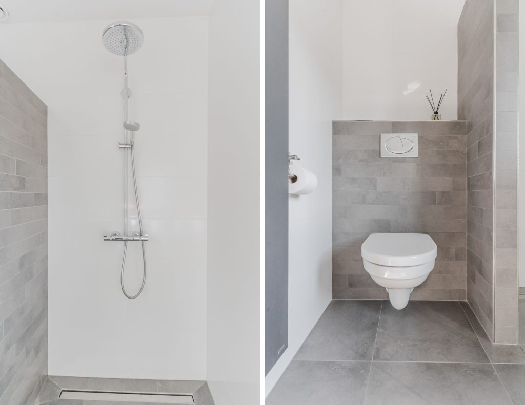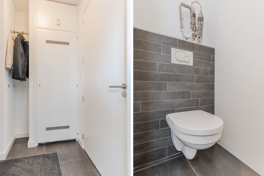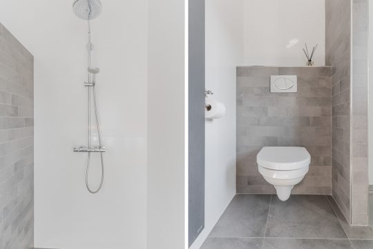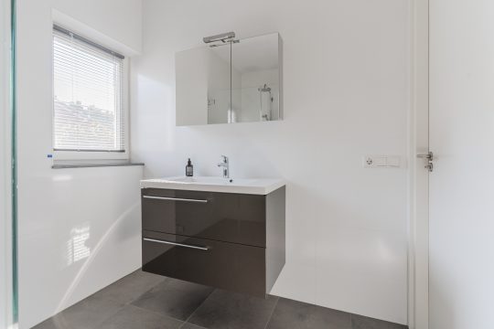 De badkamer is modern en luxe ingericht, volledig voorzien van vloerverwarming voor extra comfort. Er is een ruime inloopdouche met hand- en regendouche, een wastafelmeubel met verlichte spiegel, een hangcloset en zowel mechanische als natuurlijke ventilatie. Alles straalt kwaliteit en verzorging uit.