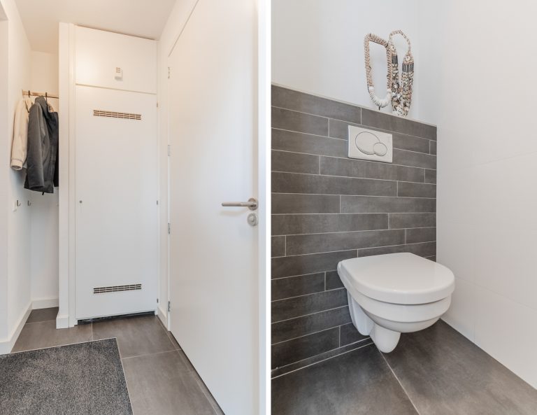 Via de eigen oprit en strak aangelegde voortuin bereik je de entreehal. Bij binnenkomst word je direct verrast door de lichte en ruime hal, voorzien van een moderne tegelvloer met vloerverwarming die doorloopt over de gehele begane grond. Vanuit hier heb je toegang tot de toiletruimte met hangcloset, fonteintje en mechanische ventilatie, de meterkast (8 groepen) en het woongedeelte.