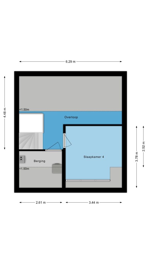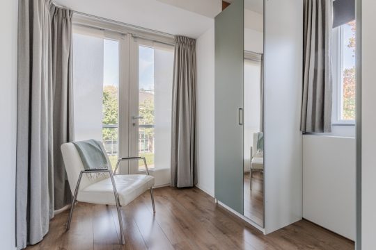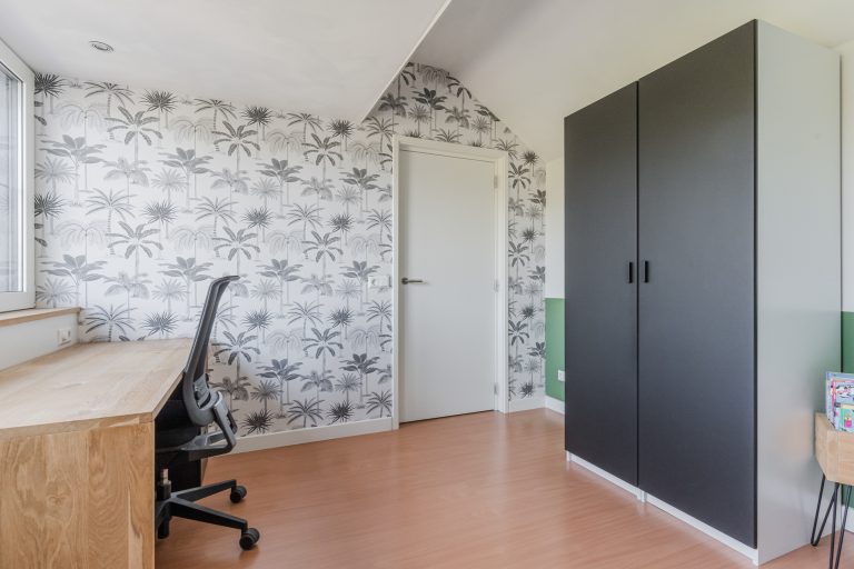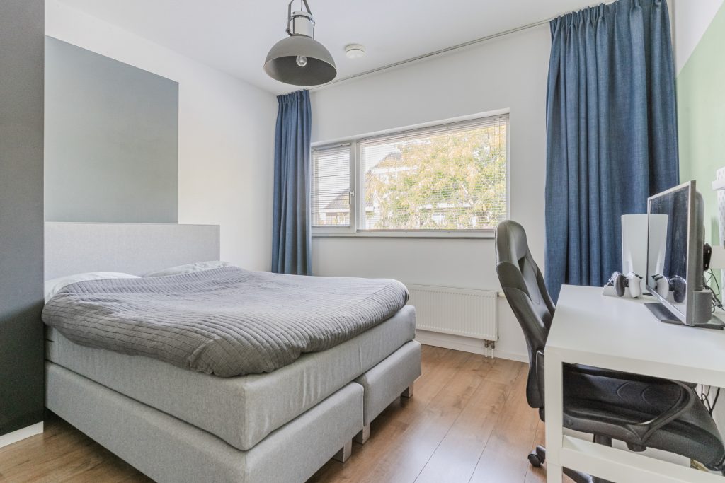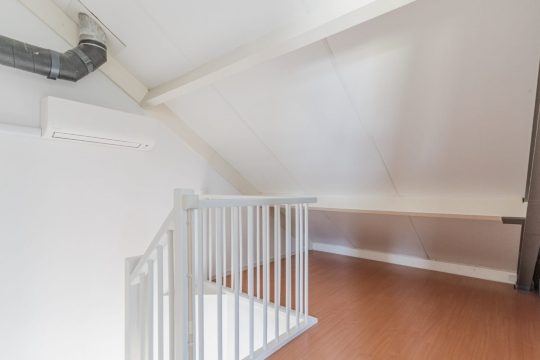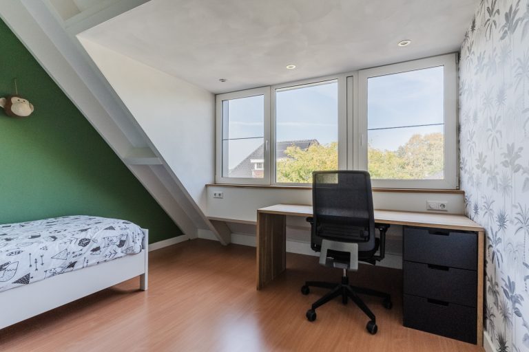 De vaste trap leidt naar de tweede verdieping, waar je een grote vierde slaapkamer, een separate wasruimte en volop bergruimte vindt. Dankzij de hoge nok en de onderhoudsvrije dakkapel (trespa) met elektrisch rolluik en vliegenhorren is dit een lichte, volwaardige kamer die ideaal is als slaapkamer, werkkamer of hobbyruimte. De wasruimte is praktisch in gebruik en voorzien van de witgoedaansluitingen, de WTW-installatie en de HR-combiketel (Nefit, 2011). Daarnaast is er volop bergruimte en is de overloop voorzien van een Daikin airconditioning (2021) die zowel de tweede als eerste verdieping koelen.
