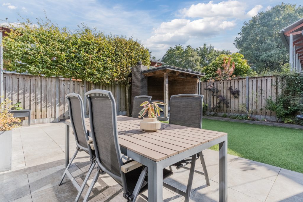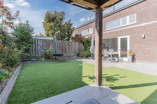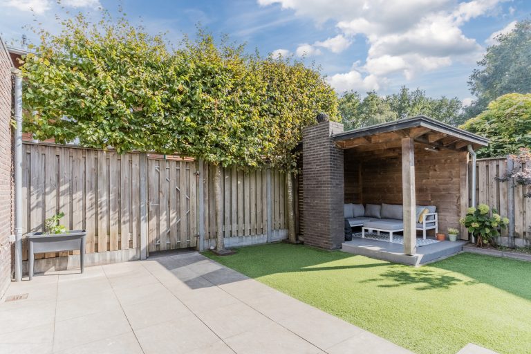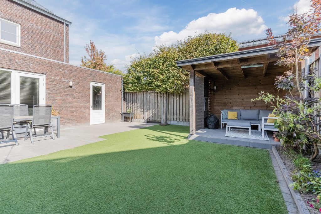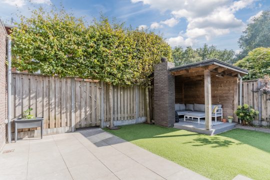 De tuin is sfeervol aangelegd en voorzien van een chique, eiken overkapping met houthaard, keramische tegels, inbouwspots en elektra, perfect om het hele jaar door te genieten van de avondzon. Hier kun je ontspannen, barbecueën of genieten van lange zomeravonden in privacy. De achtertuin op het zuiden is een oase van rust. Het strak betegelde terras grenzend aan de woning, de borders met vaste beplanting en het kunstgras maken de tuin niet alleen sfeervol maar ook nog eens onderhoudsvriendelijk.