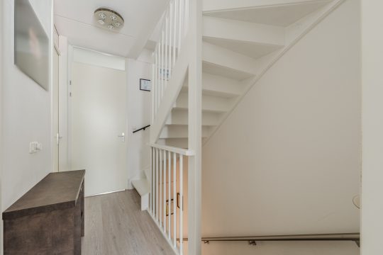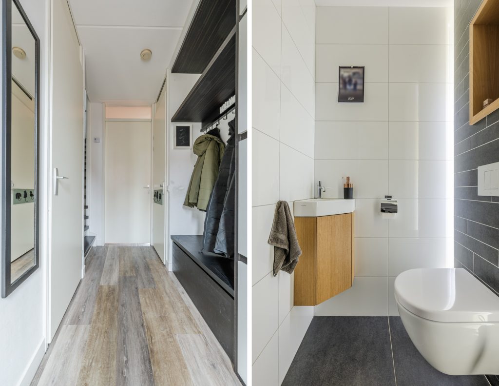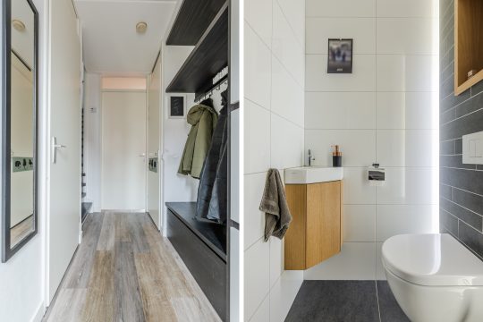 Parkeren kan eenvoudig op de brede oprit die plaats biedt voor twee auto’s. Je komt binnen in een ruime entree voorzien van een maatwerk garderobekast met volop bergruimte. De toiletruimte is volledig betegeld en strak afgewerkt. Je ziet een nis met verlichting, een hangcloset en een fonteintje. Tevens is er toegang tot een praktische bergkast met de CV-installatie (Intergas, 2015) en de meterkast met 12 groepen, een fornuisgroep en glasvezel.