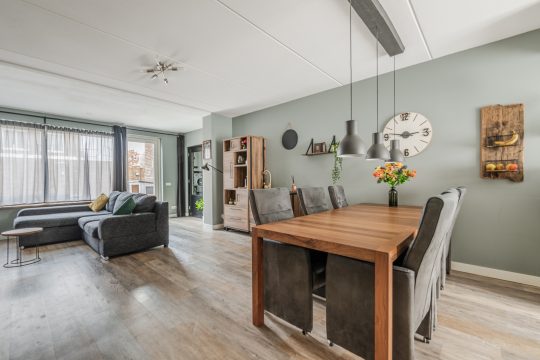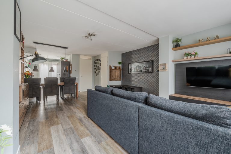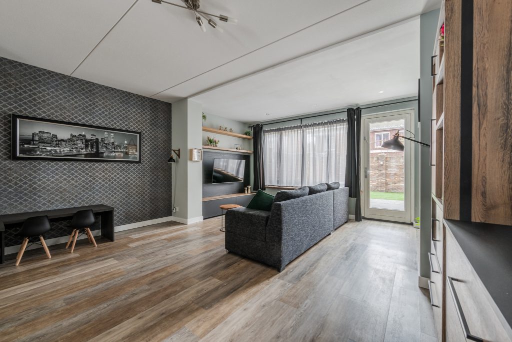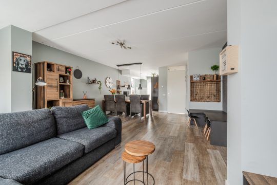De begane grond is afgewerkt met een PVC vloer en vloerverwarming. De woonkamer is over de volle breedte 2,5 meter uitgebouwd. Dit zorgt voor veel leefruimte en licht. Aan de achterzijde is een royaal zitgedeelte met plek voor een grote hoekbank, welke in directe verbinding staat met de achtertuin. Aansluitend heb je toegang tot de bijkeuken. In het midden van de woonkamer is ruimte voor een speelhoek voor de kinderen. De trapkast biedt extra bergruimte.