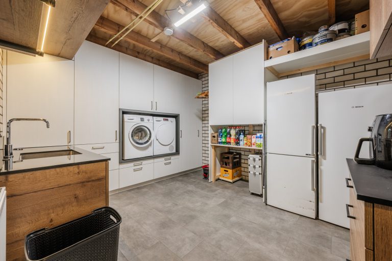De bijkeuken is praktisch ingericht en voorzien van een PVC vloer. Hier is een maatwerk meubel met witgoedaansluitingen (ter overname) op hoogte geplaatst. Je hebt veel kastruimte en een keukenblok met warm en koud water. Vanuit hier bereik je de inpandige garage. Deze is voorzien van een geïsoleerde elektrische garagedeur en meerdere elektrapunten.