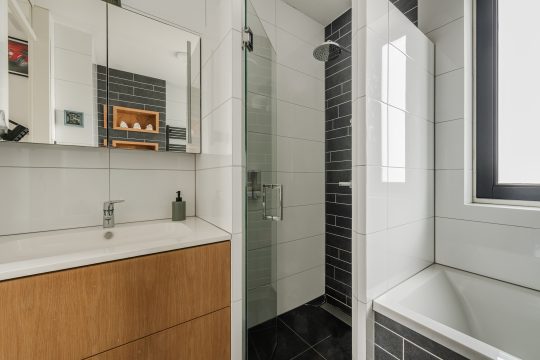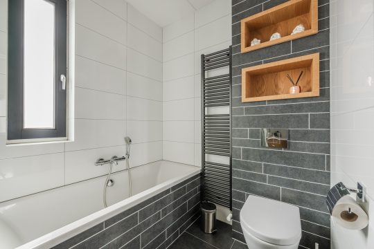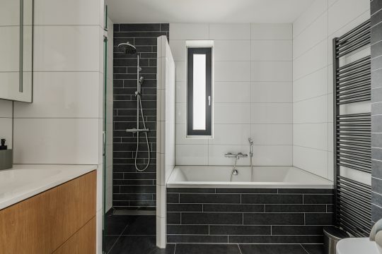 De badkamer is modern en volledig betegeld. Je vindt hier een groot ligbad en een inloopdouche met een nis voor toiletartikelen, hangcloset, designradiator en vloerverwarming. Het grote badmeubel heeft een verlichte spiegelkast en biedt veel opbergruimte. De badkamer heeft zowel mechanische als natuurlijke ventilatie.