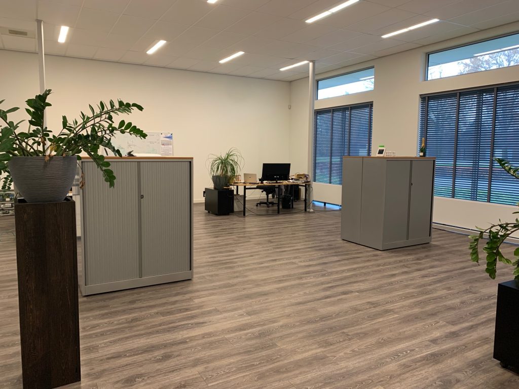Eén kantoorruimte met pvc-vloer, stucwerk wanden, verlaagd systeemplafond met ledverlichting