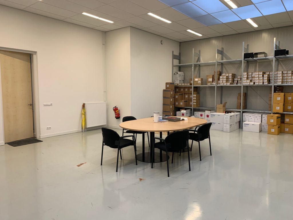 Showroom / kantoorruimte met ESD vloercoating, stucwerk wanden, systeemplafonds en LED-verlichting.