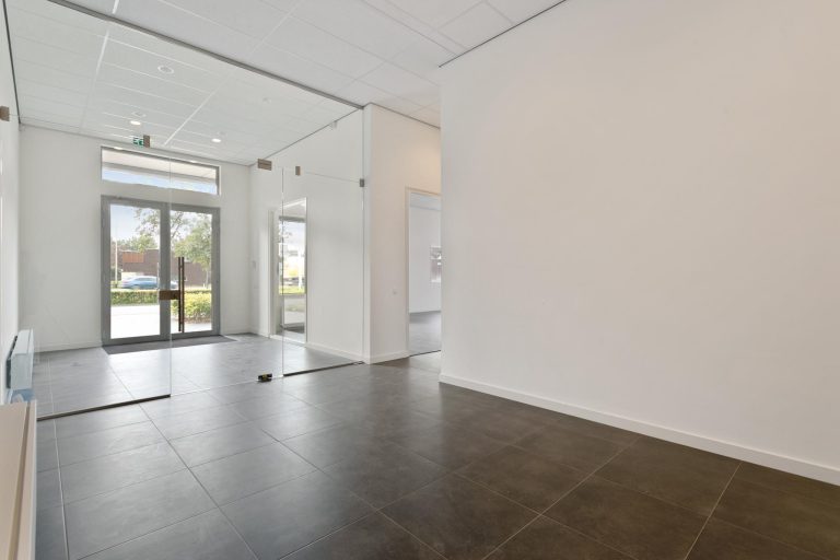 Middels dubbele openslaande deuren toegang tot een riante gezamenlijke ontvangsthal met moderne tegelvloer, stucwerk wanden en systeemplafond met inbouwspots.