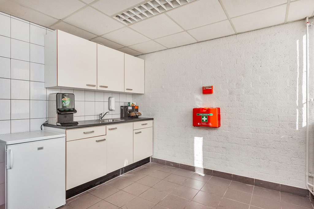 Geheel betegelde personeels- toilet-/wasruimte met 2 toiletten, 2 urinoirs, wasbak en toegang tot de lockerruimte en kantine. Kantine met tegelvloer, systeemplafond met TL-verlichting en een keukenblok.