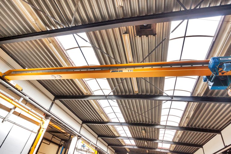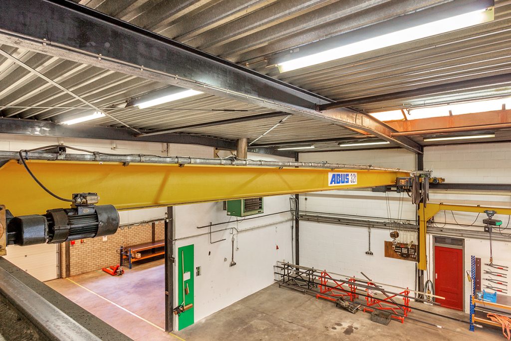 Royale multifunctionele bedrijfsruimte met een drukvaste betonvloer, TL-verlichting, meerdere lichtstraten, 2 elektrisch bedienbare segmentdeuren, uitgebreide groepenkast en 2 kraanbanen met 4 kraanliggers van 3.2 ton.