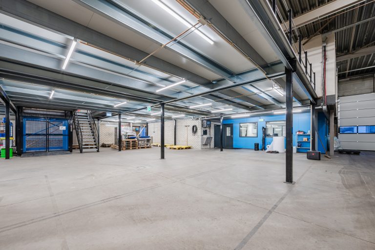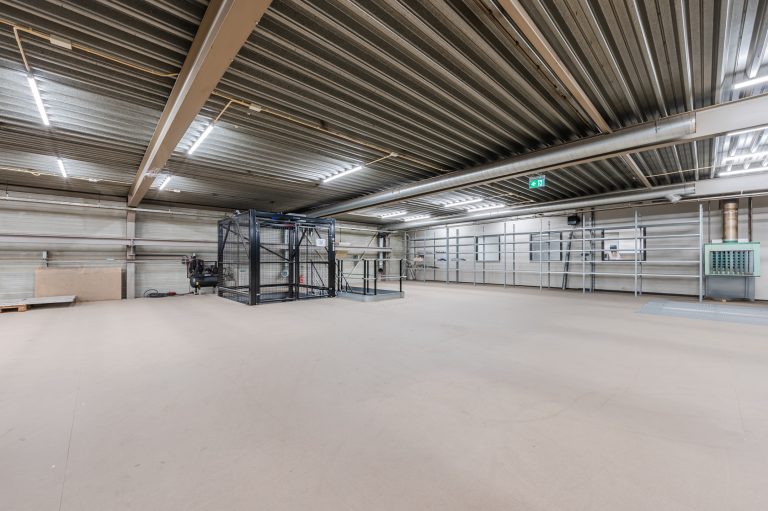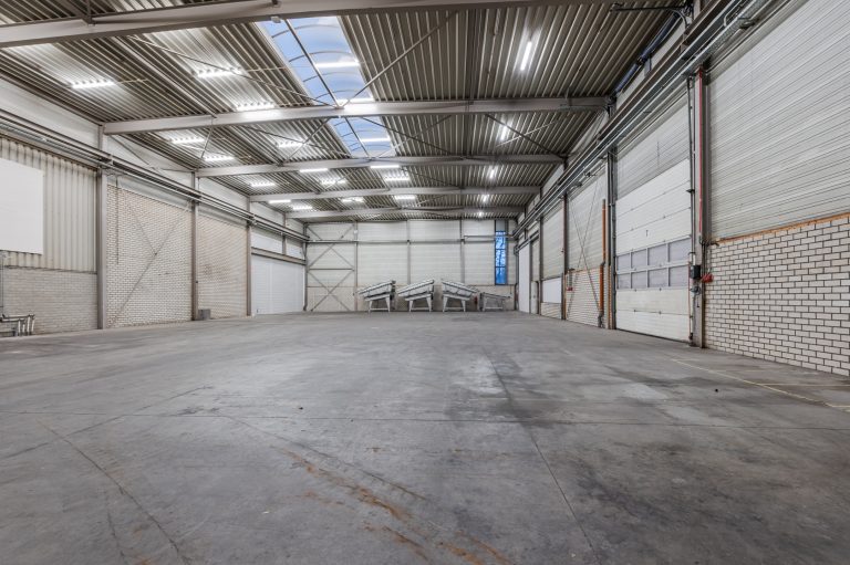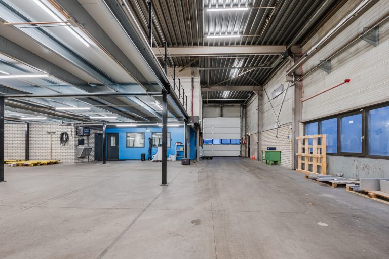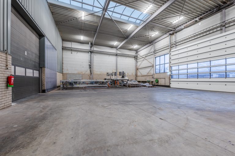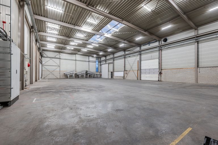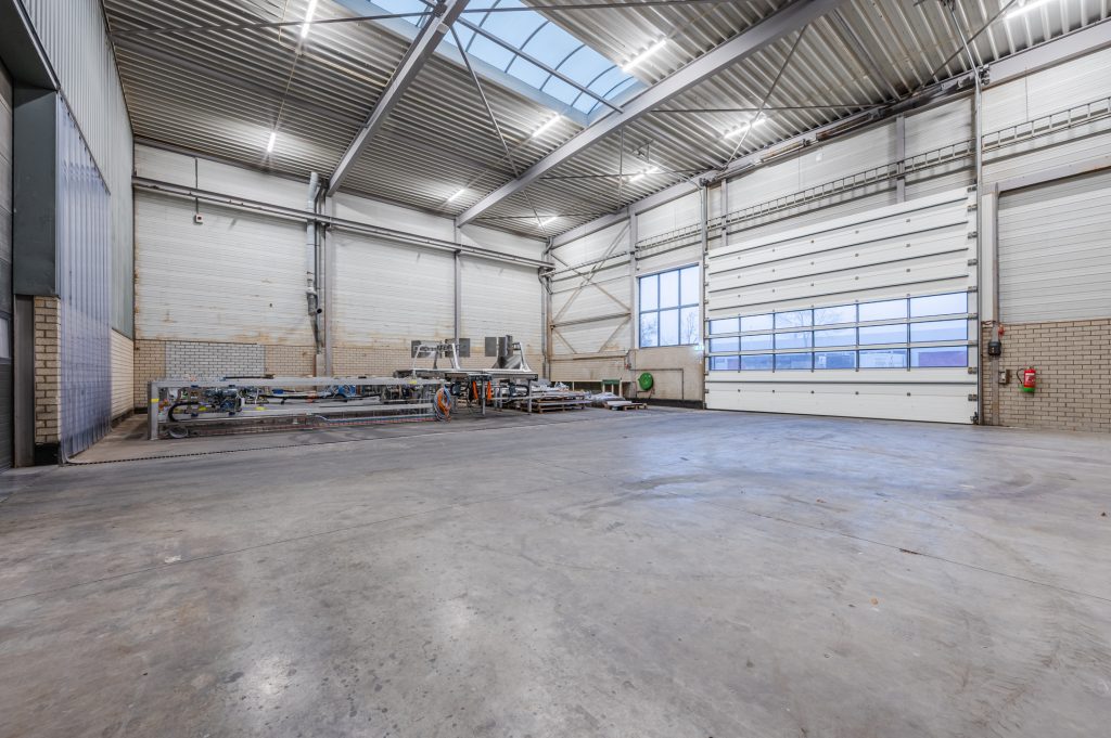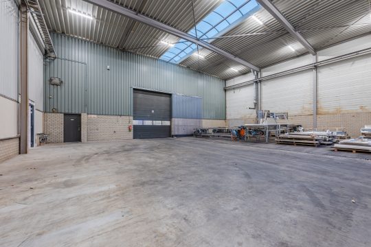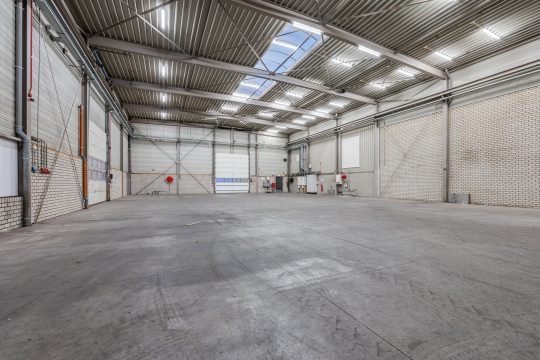 – Bedrijfshal voorzien van drukvaste betonvloer. Vrije hoogte linkerzijde 5,5 meter, rechterzijde 7,7 meter