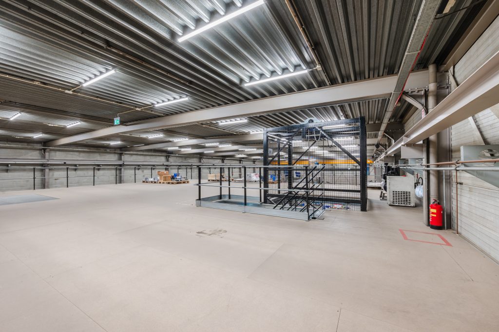 – Entresolvloer voor opslag met goederenlift, de entresolvloer kan verwijderd worden.
