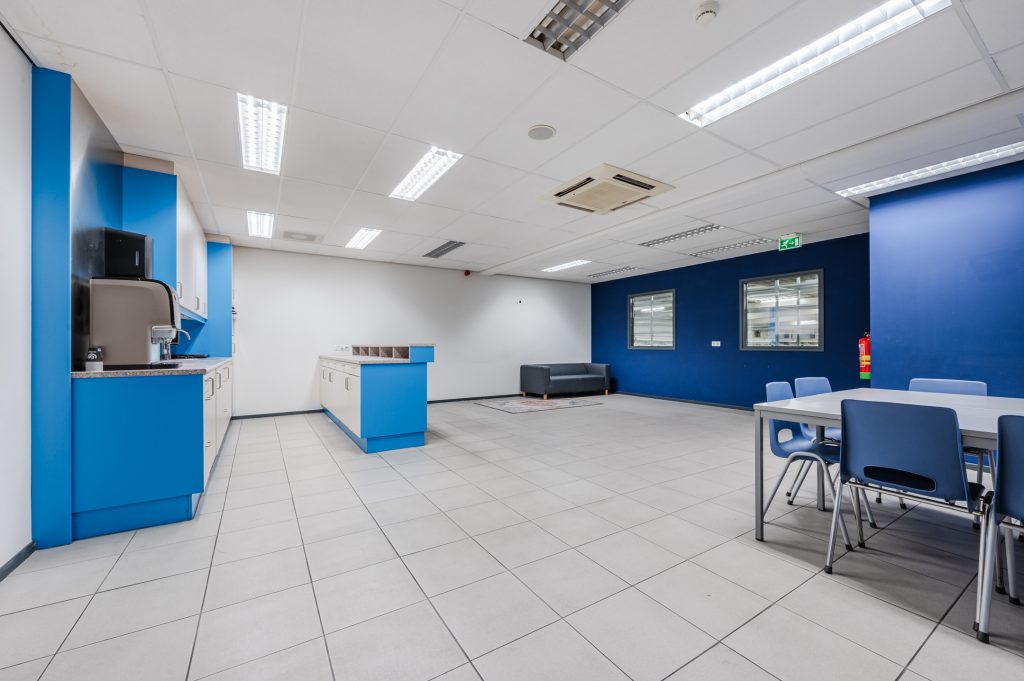 – Kantine met tegelvloer en keukeninrichting