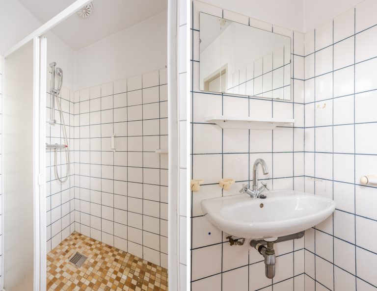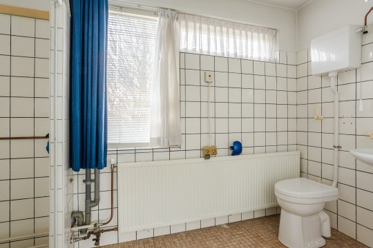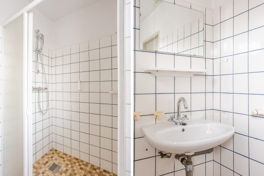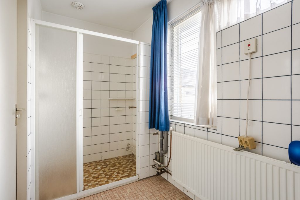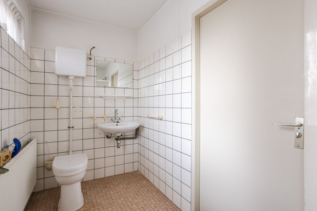 De badkamer is grotendeels betegeld en ingericht met een douchecabine, toilet en wastafel – functioneel en klaar om naar wens te moderniseren.