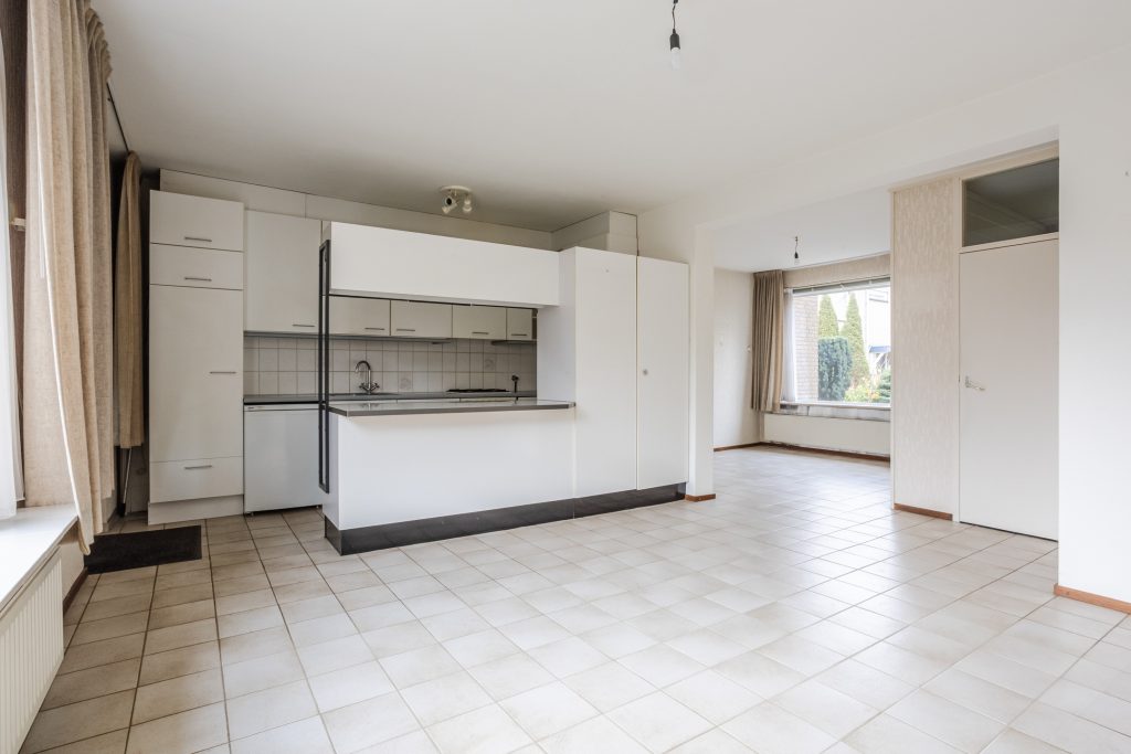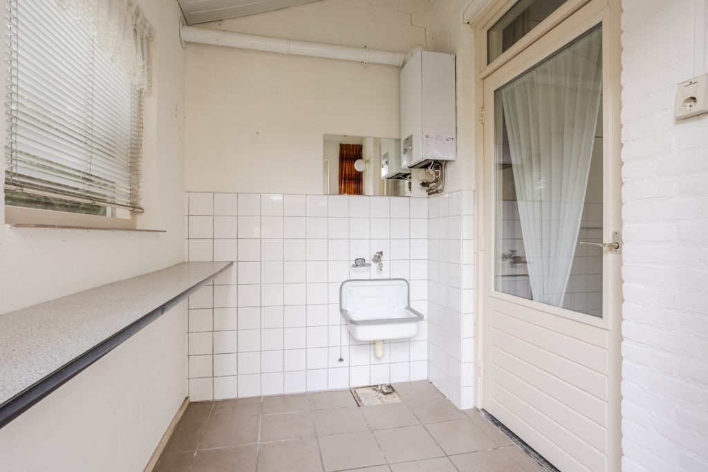 Aangrenzend vind je de praktische bijkeuken met tegelvloer, uitstortgootsteen en keukengeiser – ideaal voor extra opslag of als wasruimte.