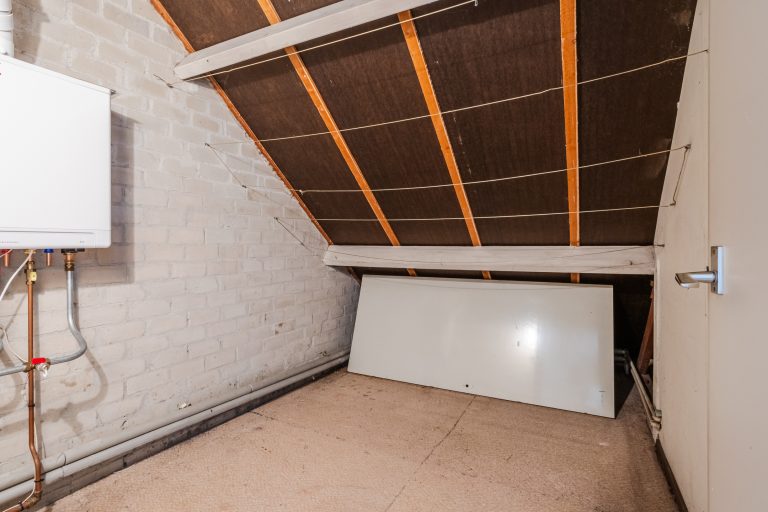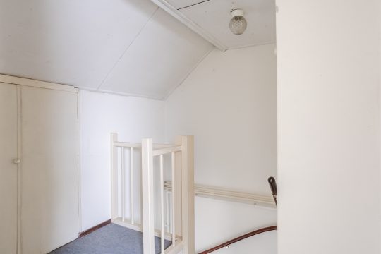 Via de vaste trap bereik je de voorzolder met vloerbedekking, bergruimte onder de dakschuinte en de c.v.-ruimte met opstelling van de c.v.-ketel en toegang tot een vliering.