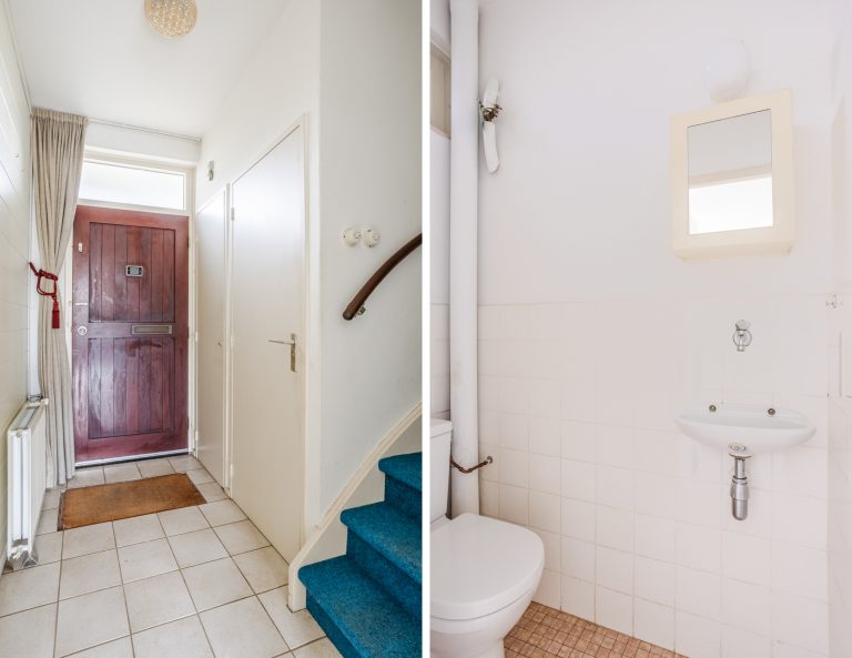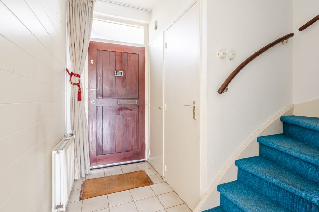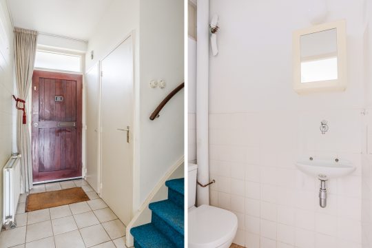 Via de overdekte entree stap je binnen in de hal met tegelvloer. Hier vind je de vernieuwde meterkast (4 groepen en 2 aardlekschakelaars), het gedeeltelijk betegelde toilet met fonteintje, de trapopgang naar boven én toegang tot de woonkamer.