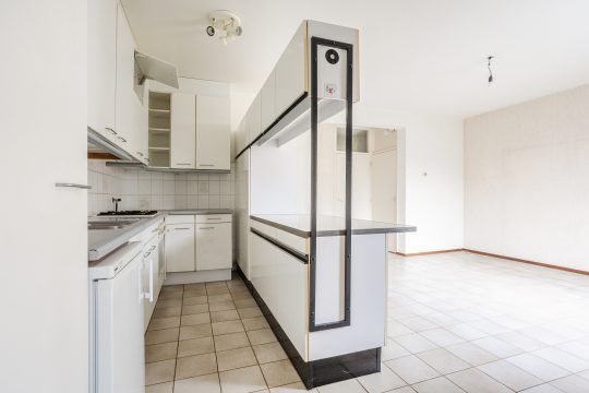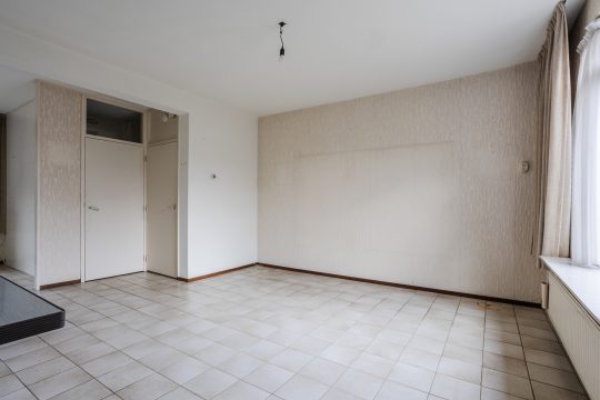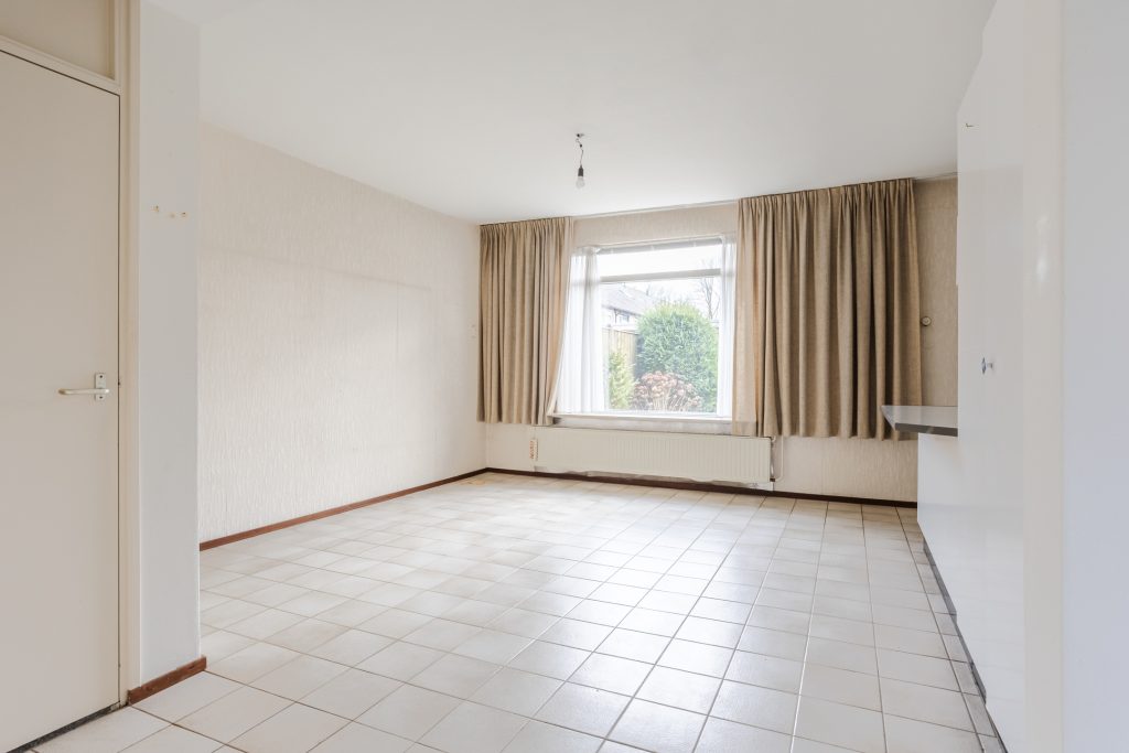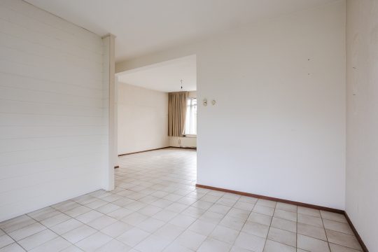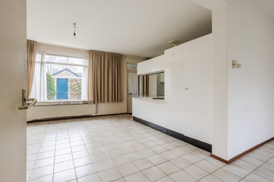 De ruime Z-vormige woonkamer is heerlijk licht en biedt volop mogelijkheden voor een royale zit- en eethoek. De tegelvloer, behangwanden en het stucwerkplafond vormen een nette basis, terwijl de praktische trapkast zorgt voor extra bergruimte. Aan de voorzijde geniet je van een vrij uitzicht over de riante openbare groenvoorziening, wat zorgt voor een prettig gevoel van ruimte en rust.