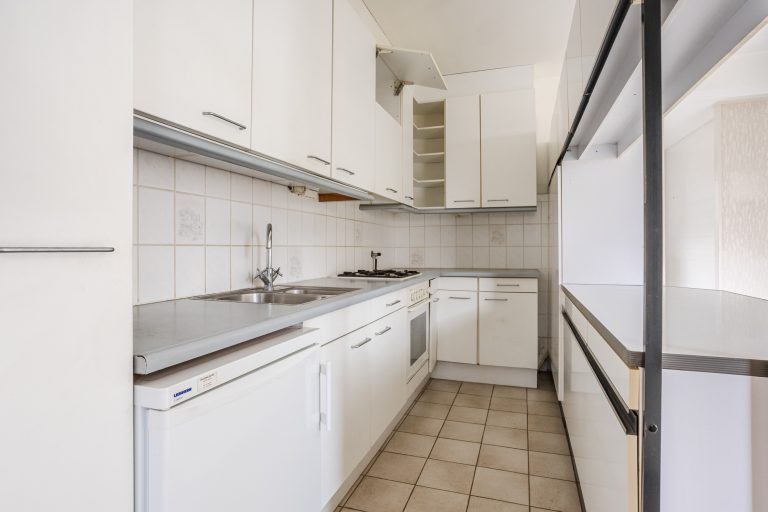 De open keuken sluit direct aan op de woonkamer en is voorzien van een eenvoudige maar functionele keukeninrichting met gaskookplaat, afzuigkap, koelkast en veel kastruimte.