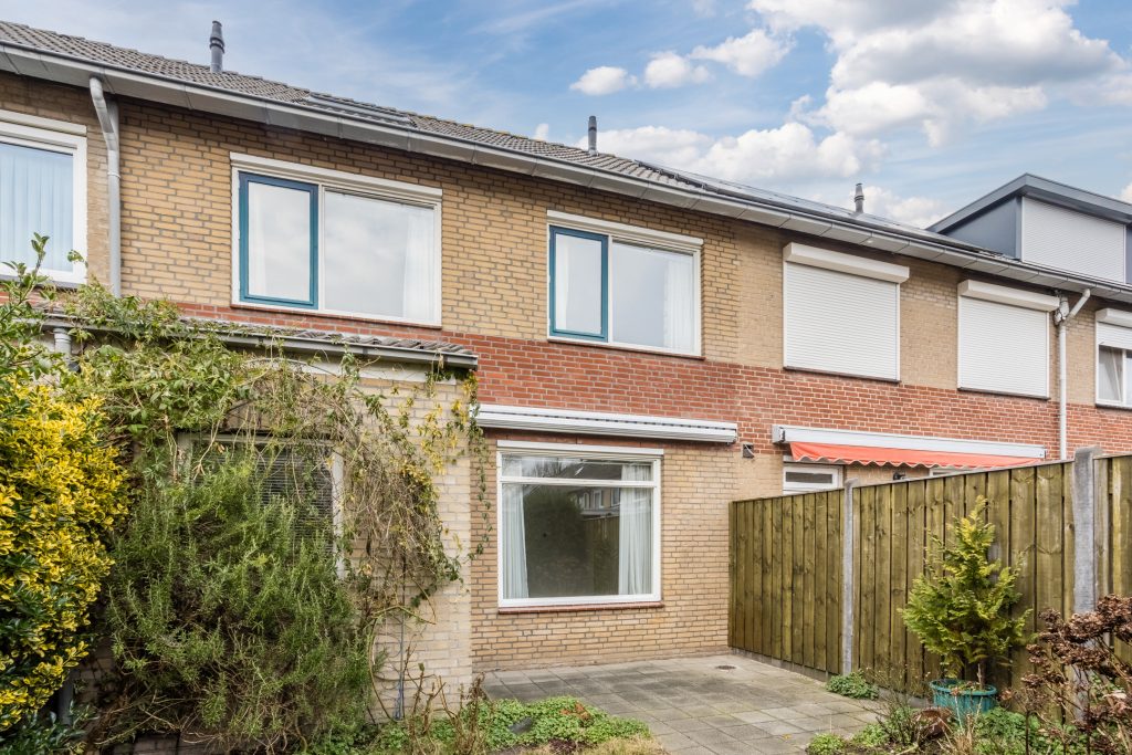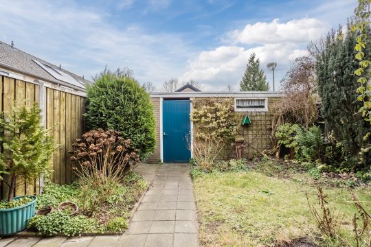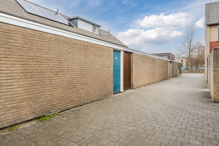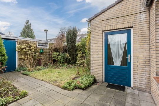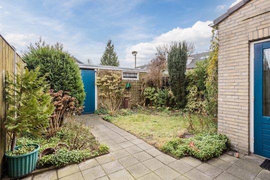 De achterzijde is misschien wel één van de grootste pluspunten: een op het zonnige zuiden gelegen, privacy biedende achtertuin met bestrating, gazon, diverse beplanting en een zonneluifel. Achterin de tuin staat een ruime gemetselde berging met elektra, en via de overdekte achterom met poort ben je zo buitenom.