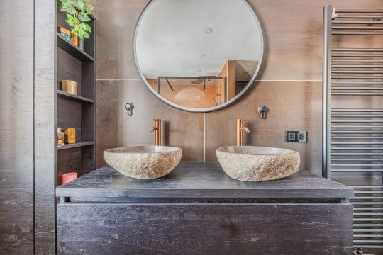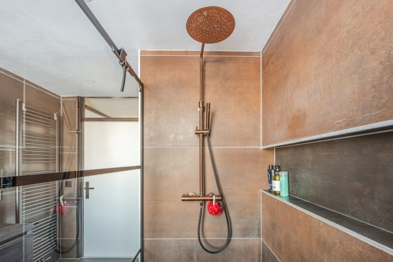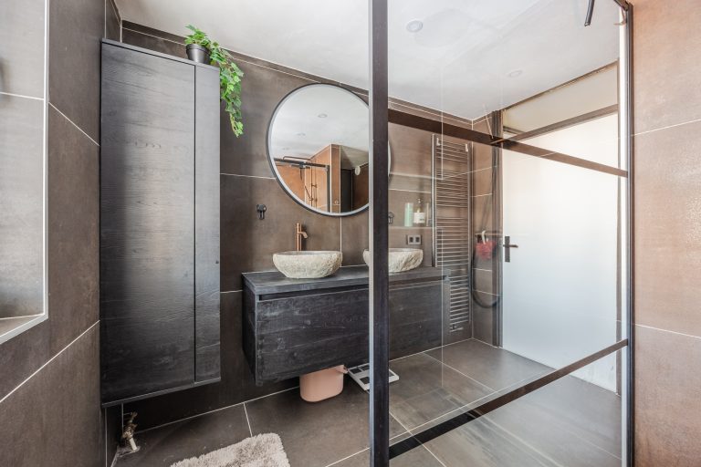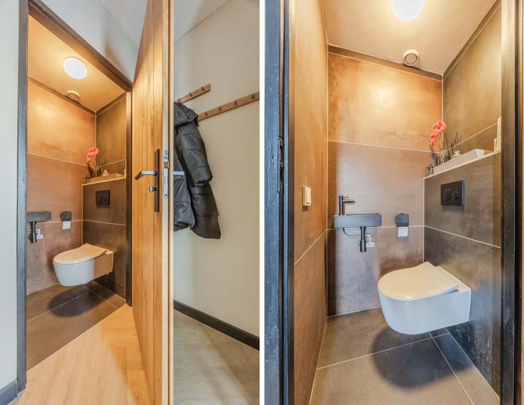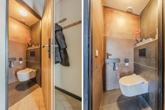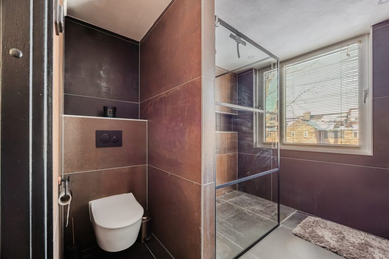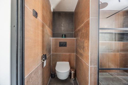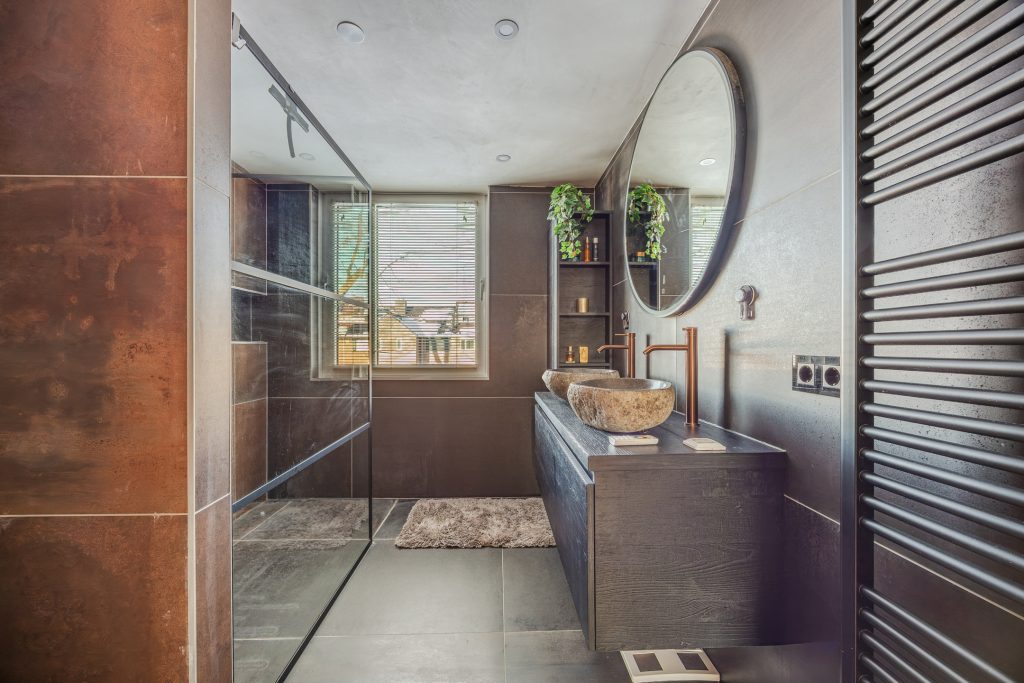 De moderne badkamer is volledig betegeld en ademt luxe. Je vindt hier een grote inloopdouche met zowel regen- als handdouche, een badmeubel met dubbele waskom, wandcloset, elektrische vloerverwarming, designradiator en een strak stucwerkplafond met inbouwspots. Een heerlijke plek om de dag ontspannen te beginnen of af te sluiten.
