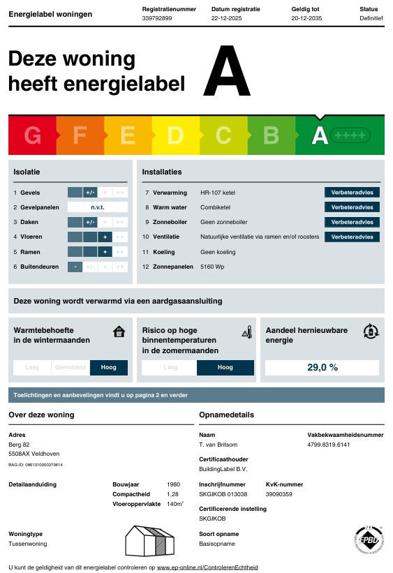 – de woning is voorzien van 12 zonnepanelen (430 Wp per stuk, geplaatst in 2024).