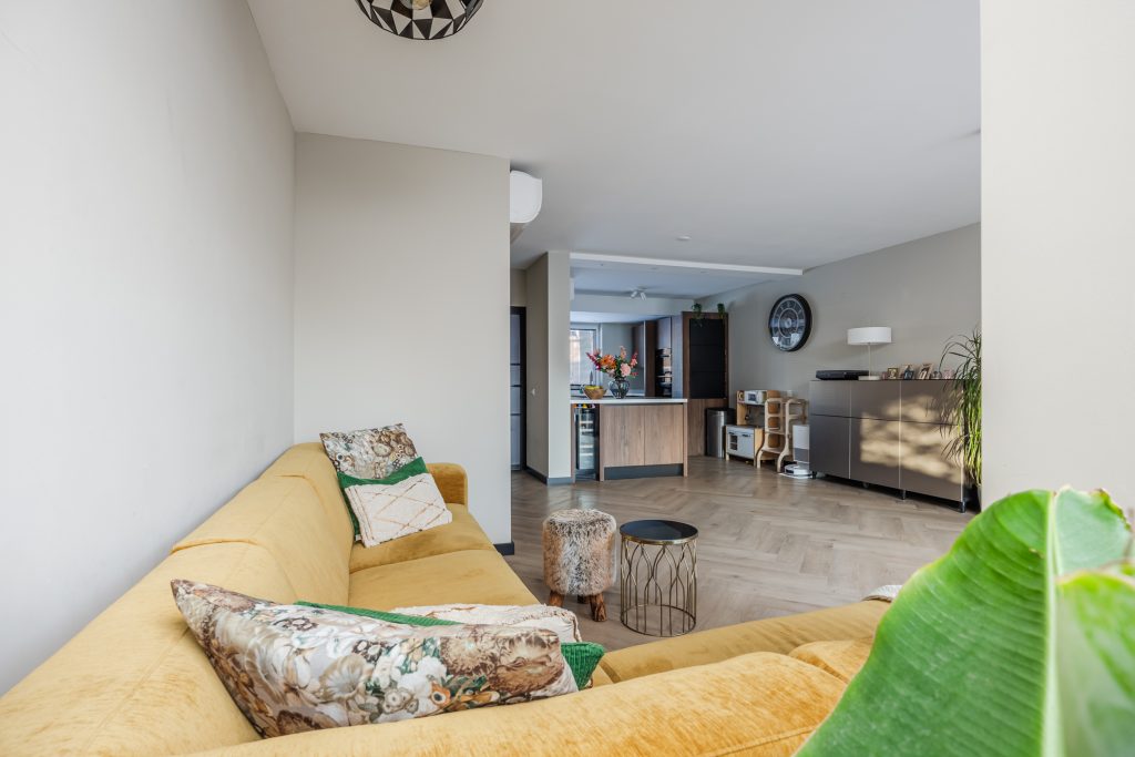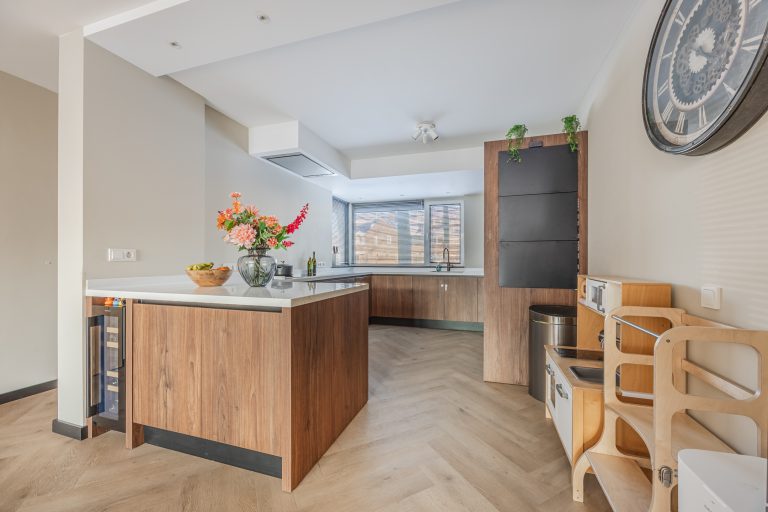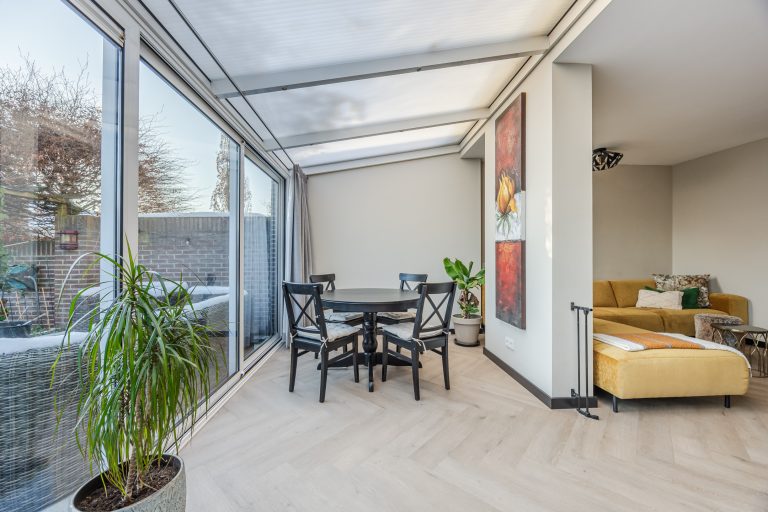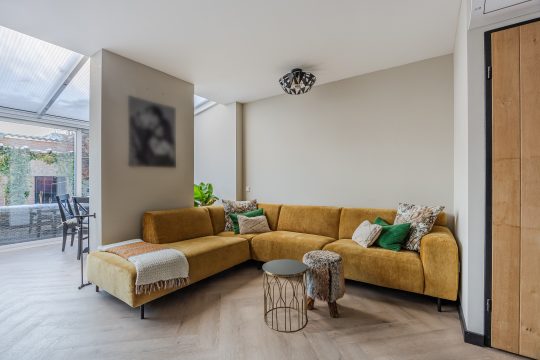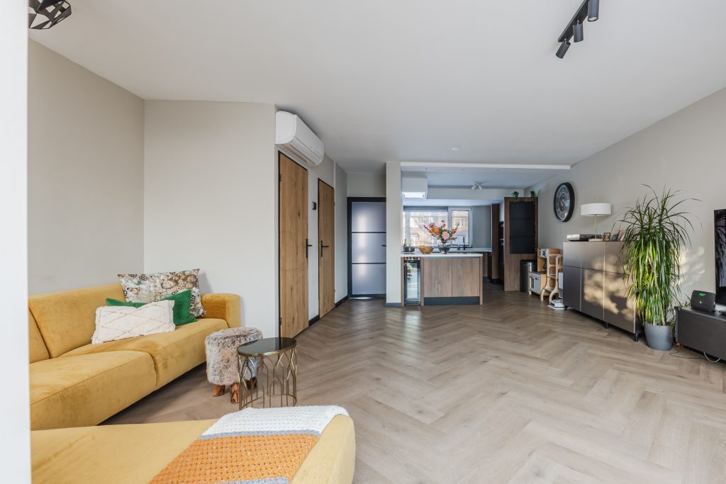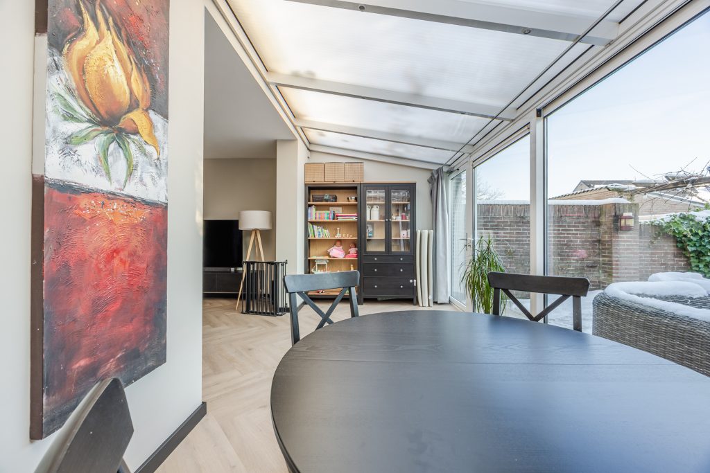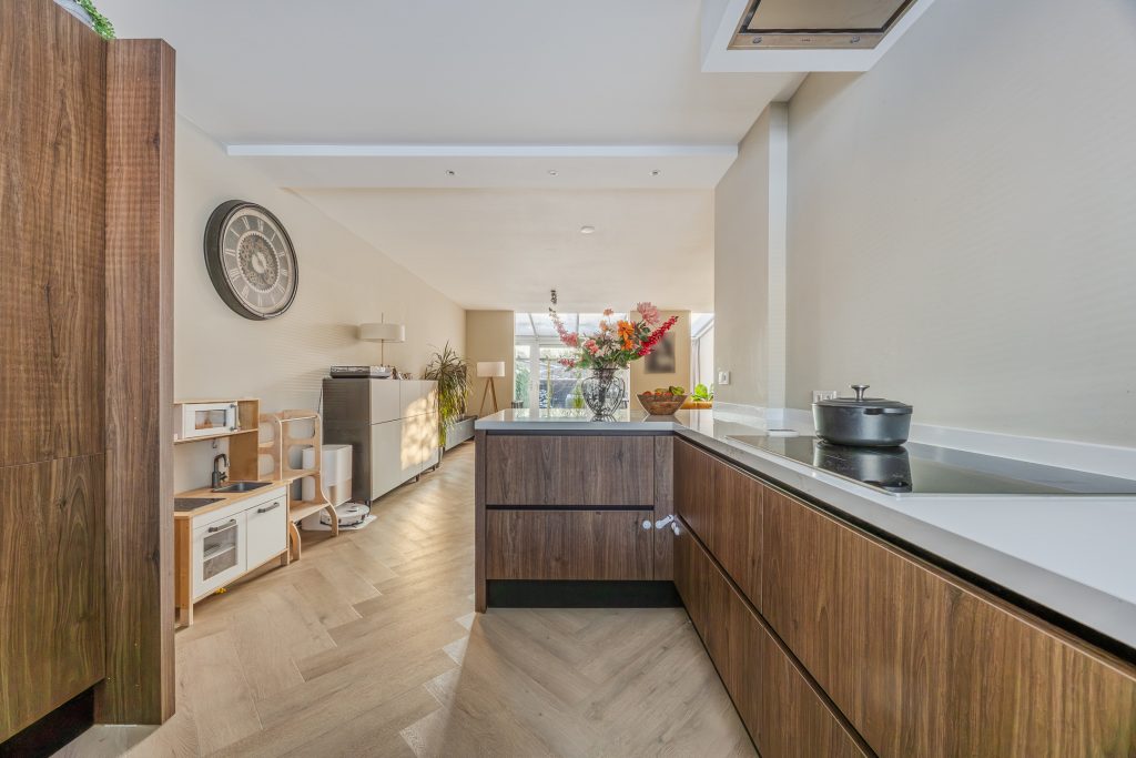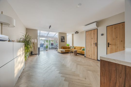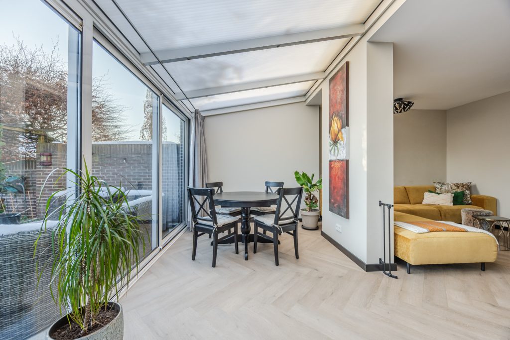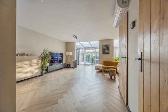 De zeer riante en uitermate sfeervolle woonkamer is zonder twijfel het kloppend hart van deze woning. Dankzij de forse uitbouw is hier een zee aan ruimte ontstaan, perfect voor zowel een grote zithoek als een royale eethoek. De visgraat PVC-vloer, strak stucwerk, praktische trapkast, airconditioning (verwarmen en koelen) en vooral de enorme hoeveelheid lichtinval zorgen voor een luxe en warme uitstraling. Via de schuifpui én loopdeur stap je zo de zonnige achtertuin in – binnen en buiten lopen hier naadloos in elkaar over.