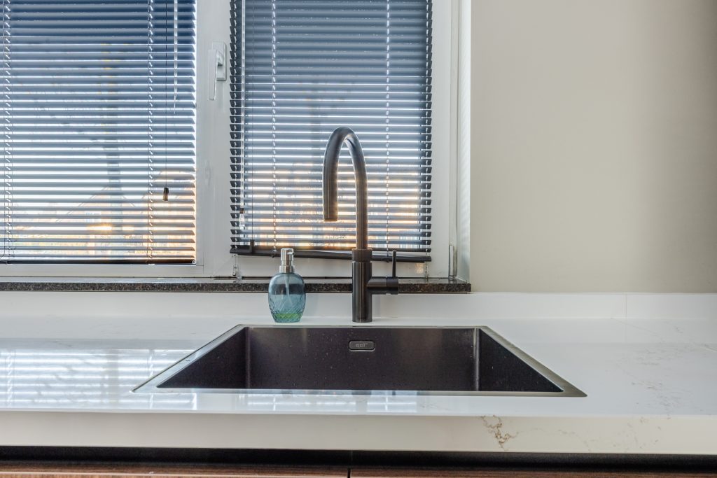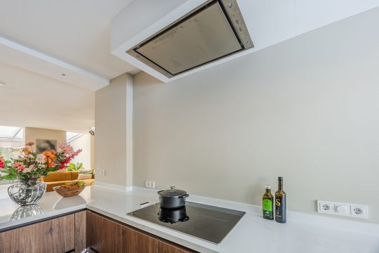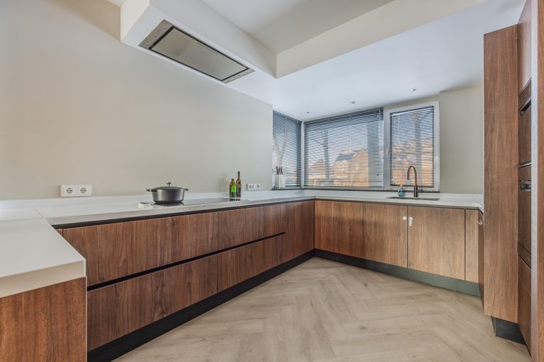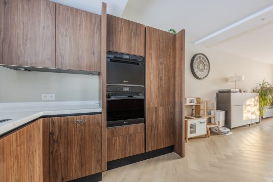 Aan de voorzijde van de woning bevindt zich de open keuken, met een prachtig uitzicht over het groen van het openbaar plantsoen. De moderne keukeninrichting in U-opstelling is een droom voor iedere kookliefhebber en uitgerust met inductiekookplaat, plafondafzuiging, combi-oven, oven, koelkast, vriezer, vaatwasser, Quooker, wijnklimaatkast en een robuust composiet werkblad. Hier kook je met plezier, in stijl én met volop werkruimte.