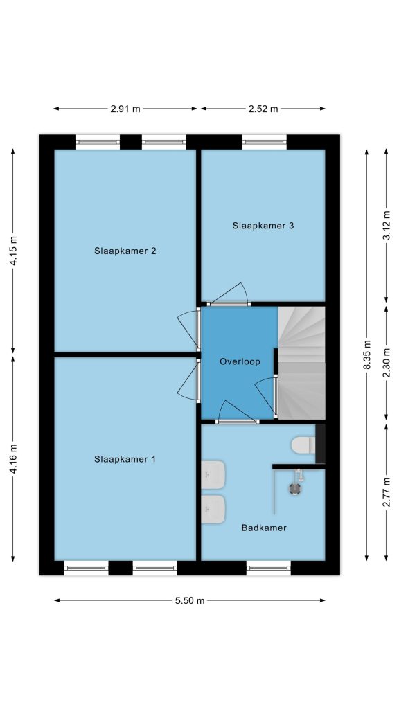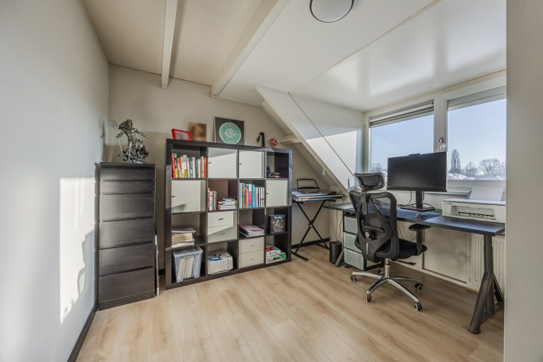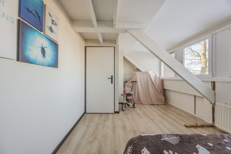 De overloop is voorzien van een nette laminaatvloer en biedt toegang tot drie royale slaapkamers, allemaal ruim van opzet en keurig afgewerkt. De grote slaapkamer aan de achterzijde beschikt bovendien over airconditioning (verwarmen én koelen), wat zorgt voor optimaal comfort in elk seizoen.