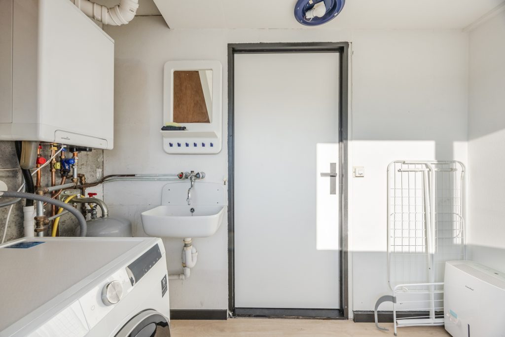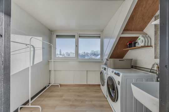 Daarnaast is er een praktische wasruimte, eveneens met laminaatvloer, waar zich de c.v.-installatie, wasmachine-aansluiting, uitstortgootsteen en extra bergruimte bevinden. Ook hier zorgt een dakkapel met elektrisch rolluik voor prettig daglicht en extra ruimte.