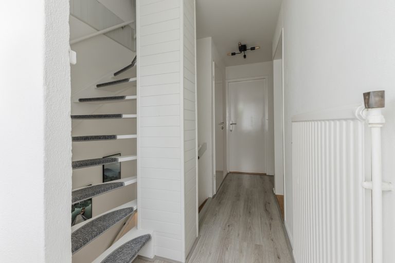 Bij binnenkomst ervaar je direct de warme uitstraling van deze woning. De hal is strak afgewerkt en biedt toegang tot het moderne toilet, de vernieuwde meterkast (8 groepen + glasvezel), garderobe en de volledig gerenoveerde trapopgang.