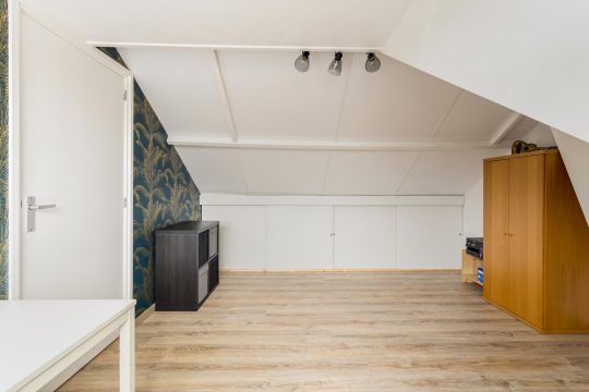 Ruime 4e slaapkamer voorzien van een laminaatvloer, behang- en stucwerkwanden, bergruimte onder de dakschuinte en dakkapel met elektrisch bedienbaar rolluik.