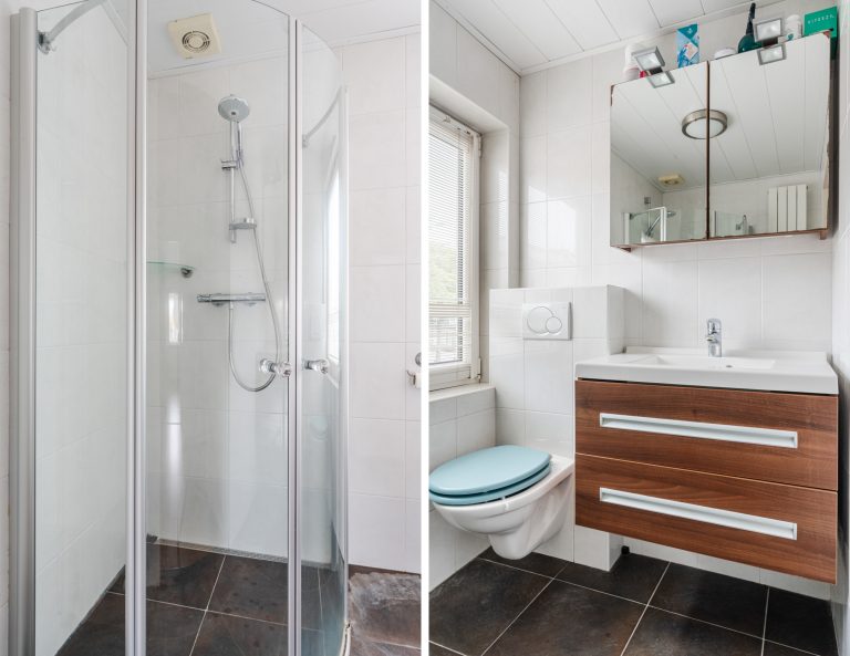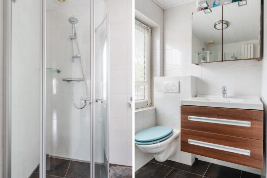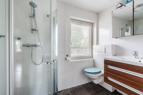 Volledig betegelde badkamer voorzien van een douchecabine, wandcloset en badmeubel met wastafel.