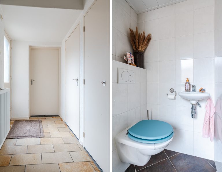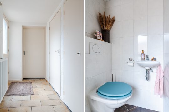 Je komt vanaf de oprit binnen in de hal welke is voorzien van een tegelvloer, volledig betegelde toiletruimte met wandcloset en fonteintje, meterkast (4 groepen) en een handige inbouwkast. De hal biedt toegang tot de woonkamer, inpandige berging aan de voorzijde en middels een trapopgang bereik je de 1e verdieping.