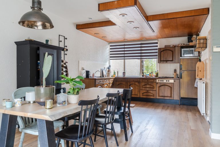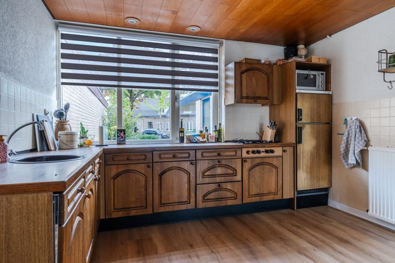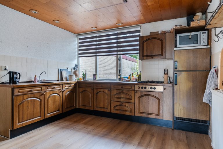 Aan de voorzijde van de woning gesitueerde open keuken met PVC-vloer en een keukeninrichting in hoekopstelling voorzien van een gaskookplaat, afzuigkap, vaatwasser, koel-/vriescombinatie en een riant aanrechtblad met ruim voldoende werkruimte.