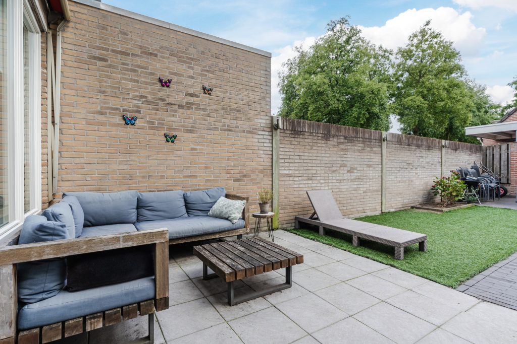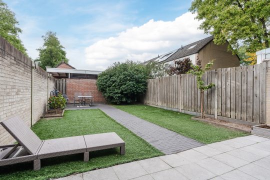 Op het zonnige westen gesitueerde, privacy biedende achtertuin met sierbestrating, kunstgras en diverse beplanting.