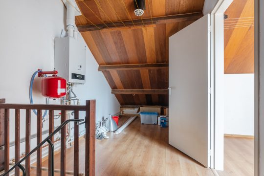 Middels een vaste trapopgang bereikbare voorzolder met een laminaatvloer, opstelling van de c.v.-installatie en toegang tot een luik met daarachter bergruimte aan beide zijden onder de dakschuinte.