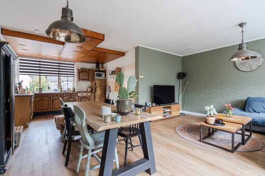 Brede en zeer lichte woonkamer met een PVC-vloer, granolwanden, stucwerkplafond en deur met toegang tot de achtertuin. Vanuit de woonkamer is er een mooi uitzicht over de royale achtertuin.