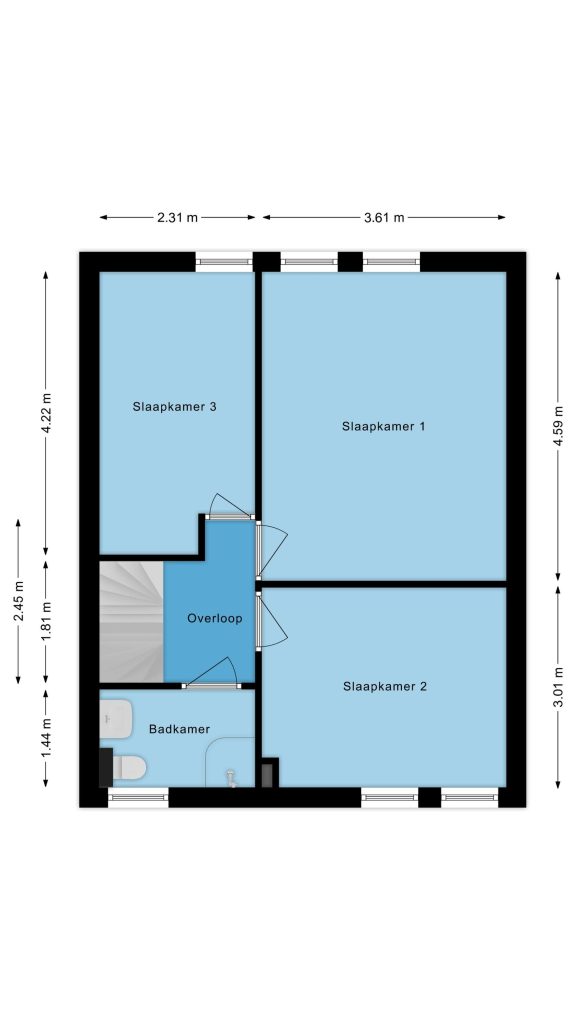 Overloop met een laminaatvloer, toegang tot 3 slaapkamers en de badkamer, alsmede een vaste trapopgang naar de 2e verdieping.