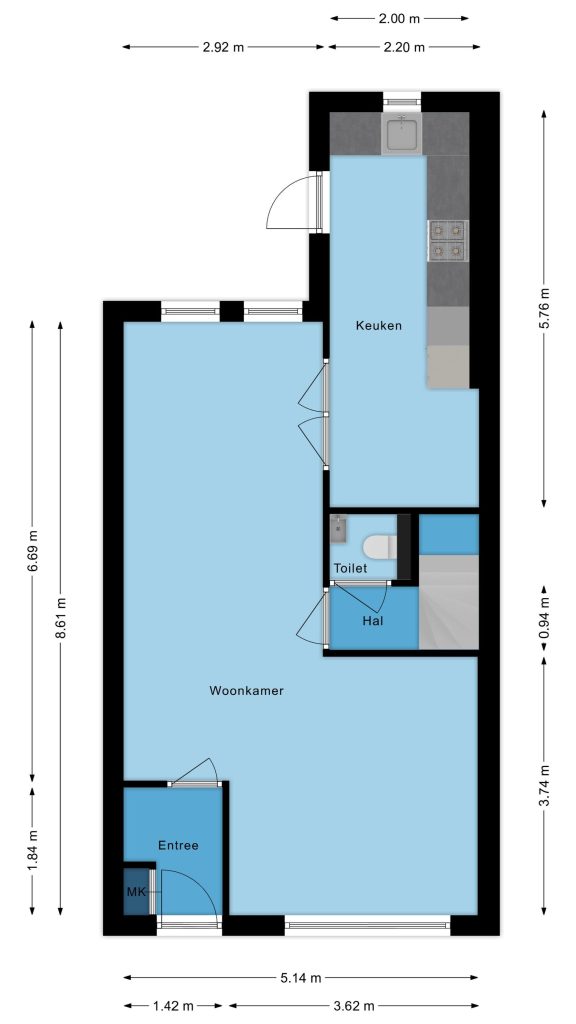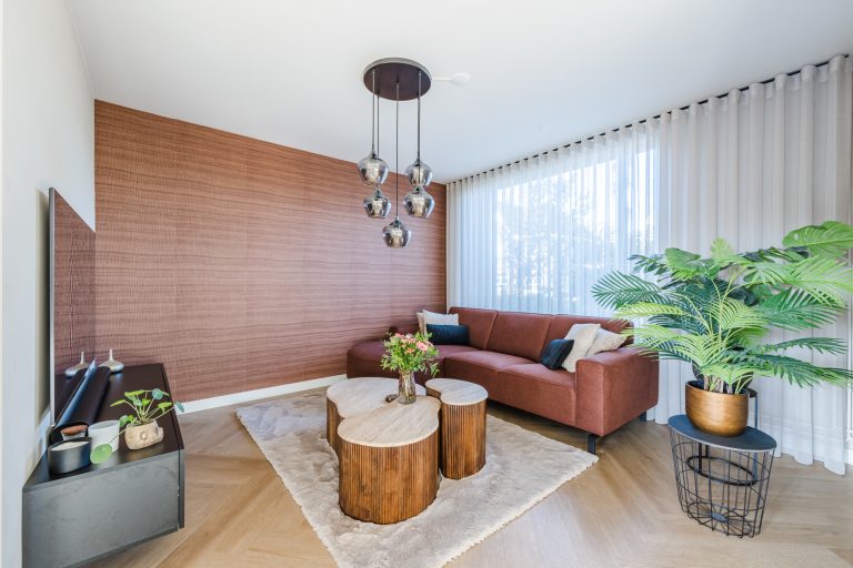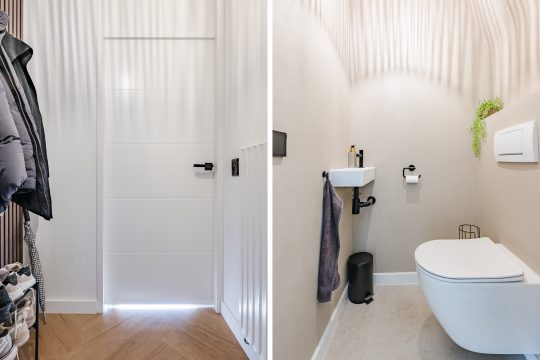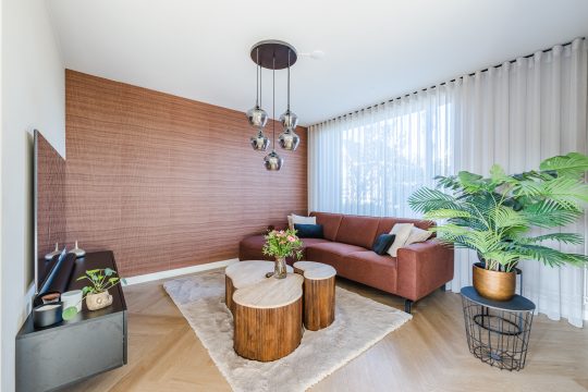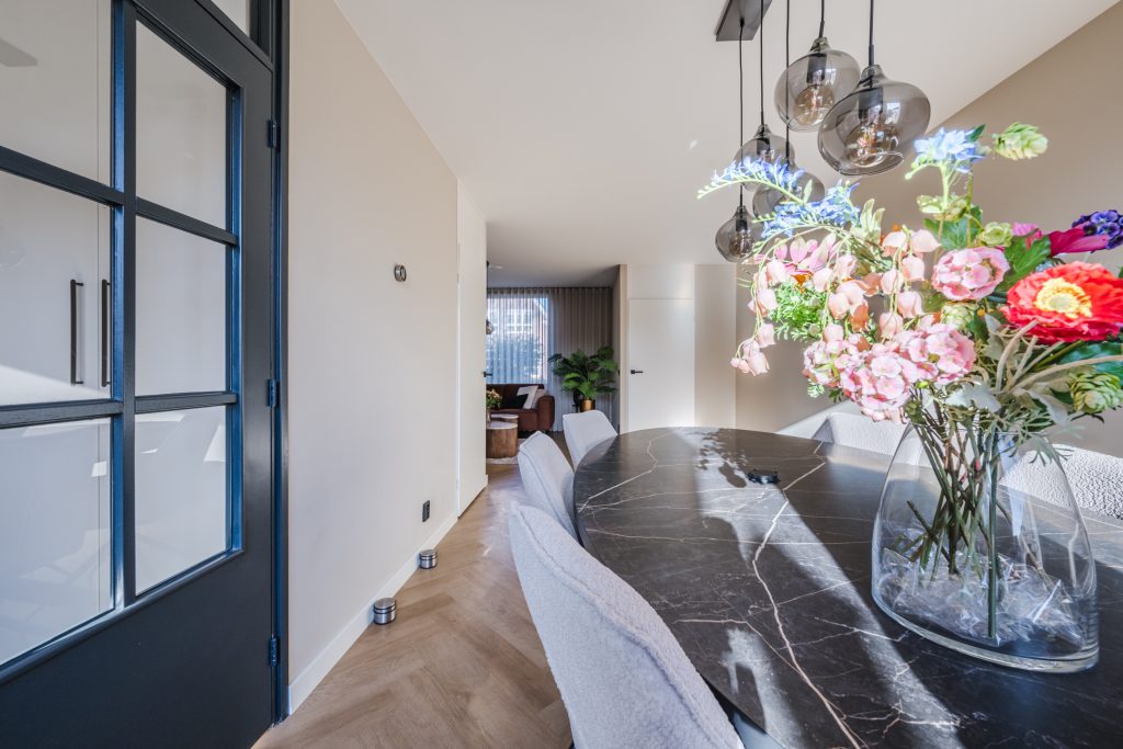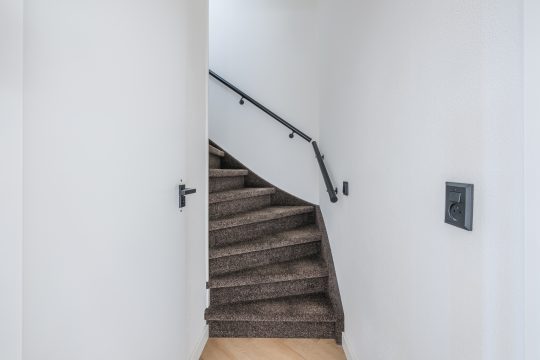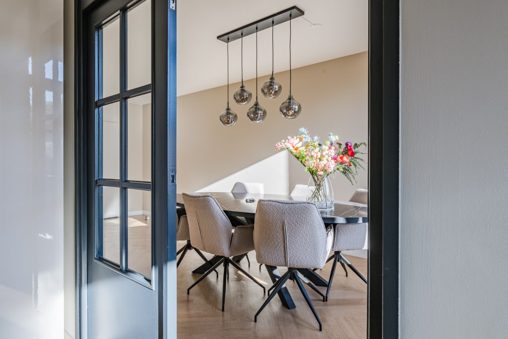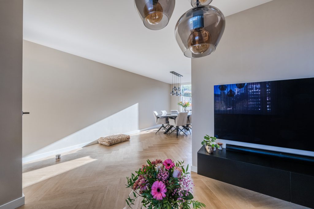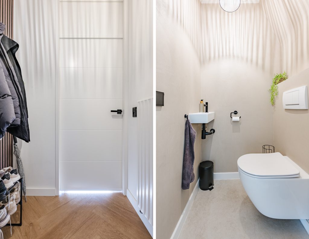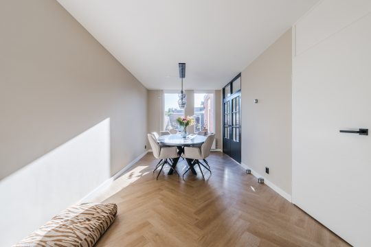 Via de entree kom je binnen in de hal, waar zich de meterkast (voorzien van glasvezel) en de garderobe bevindt. Vanuit de hal stap je binnen in de ruime woonkamer, die direct indruk maakt met zijn strak gestucte wanden en plafonds, natuurstenen vensterbanken, chique binnendeuren en een stijlvolle PVC-visgraatvloer. Het zitgedeelte aan de voorzijde beschikt over een elektrisch bedienbaar rolluik. Aan de achterzijde bevindt zich het ruime eetgedeelte. Aansluitend vind je een portaal met trapopgang ( voorzien van vernieuwde bekleding) naar de verdieping en een moderne toiletruimte met hangcloset, fonteintje en mechanische ventilatie.