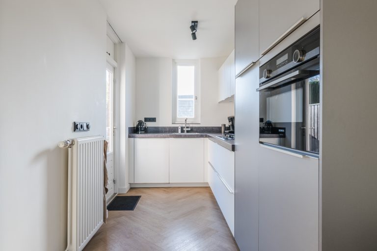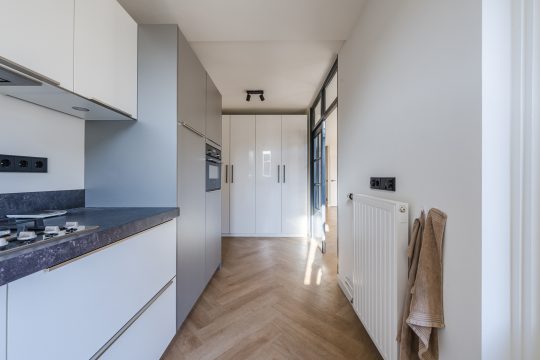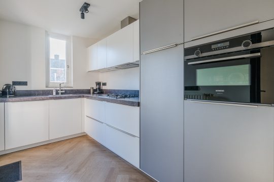De moderne, half-open keuken in een royale hoekopstelling is voorzien van hoogwaardige, grotendeels Siemens, apparatuur: een combi-oven, vaatwasser, 4-pits gasfornuis en een afzuigkap. Er is daarnaast veel praktische kastruimte aanwezig. Vanuit hier heb je toegang tot de achtertuin.